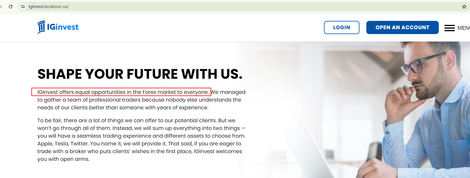 There are no regulatory details available on the website of IGinvest to support its legitimacy in the forex market, a scam indicator.