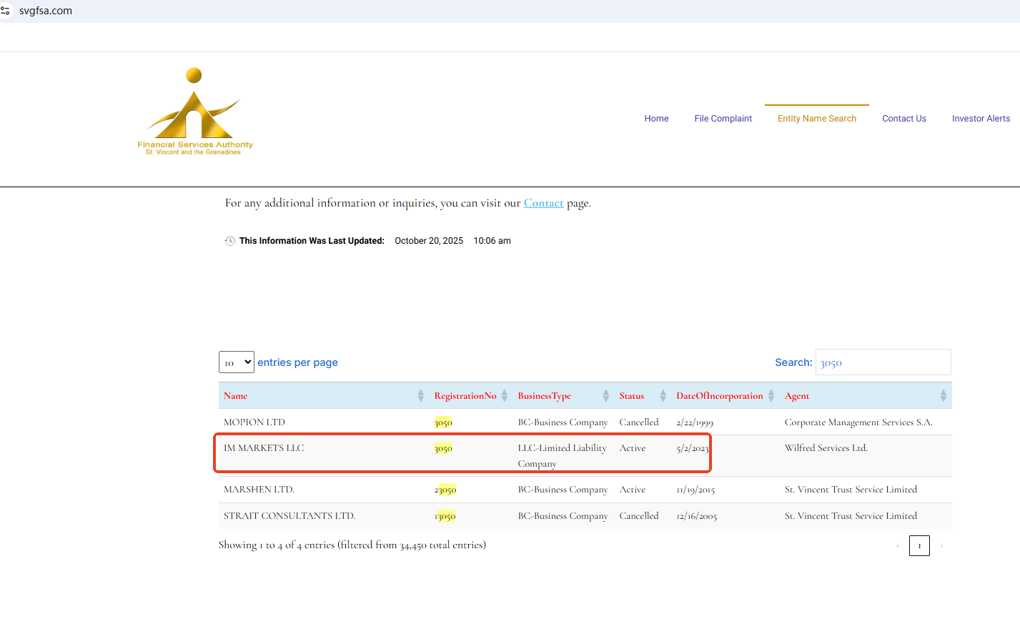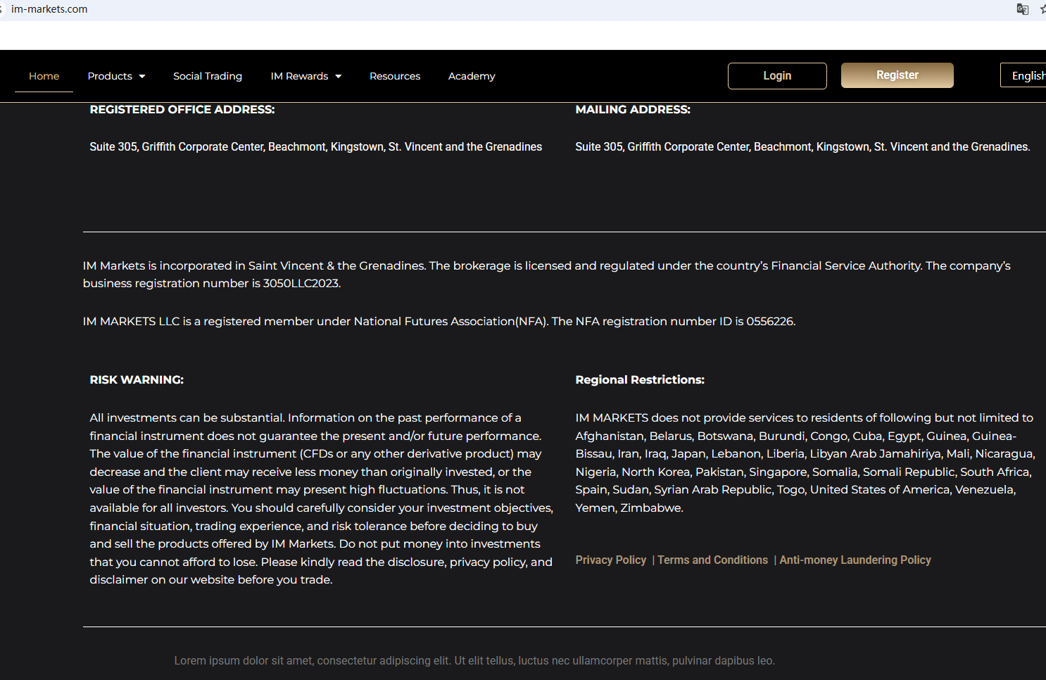 IM MARKETS claims to be registered with both the St. Vincent and the Grenadines Financial Services Authority (SVG FSA) and the National Futures Association (NFA). However, no matching information was found with the NFA. While the SVG FSA registration appears to be valid, the SVG FSA lacks regulatory authority for forex and does not constitute a valid forex license. Furthermore, IM MARKETS does not appear to be authorized by any reputable financial regulator, raising serious concerns about potential fraud.
