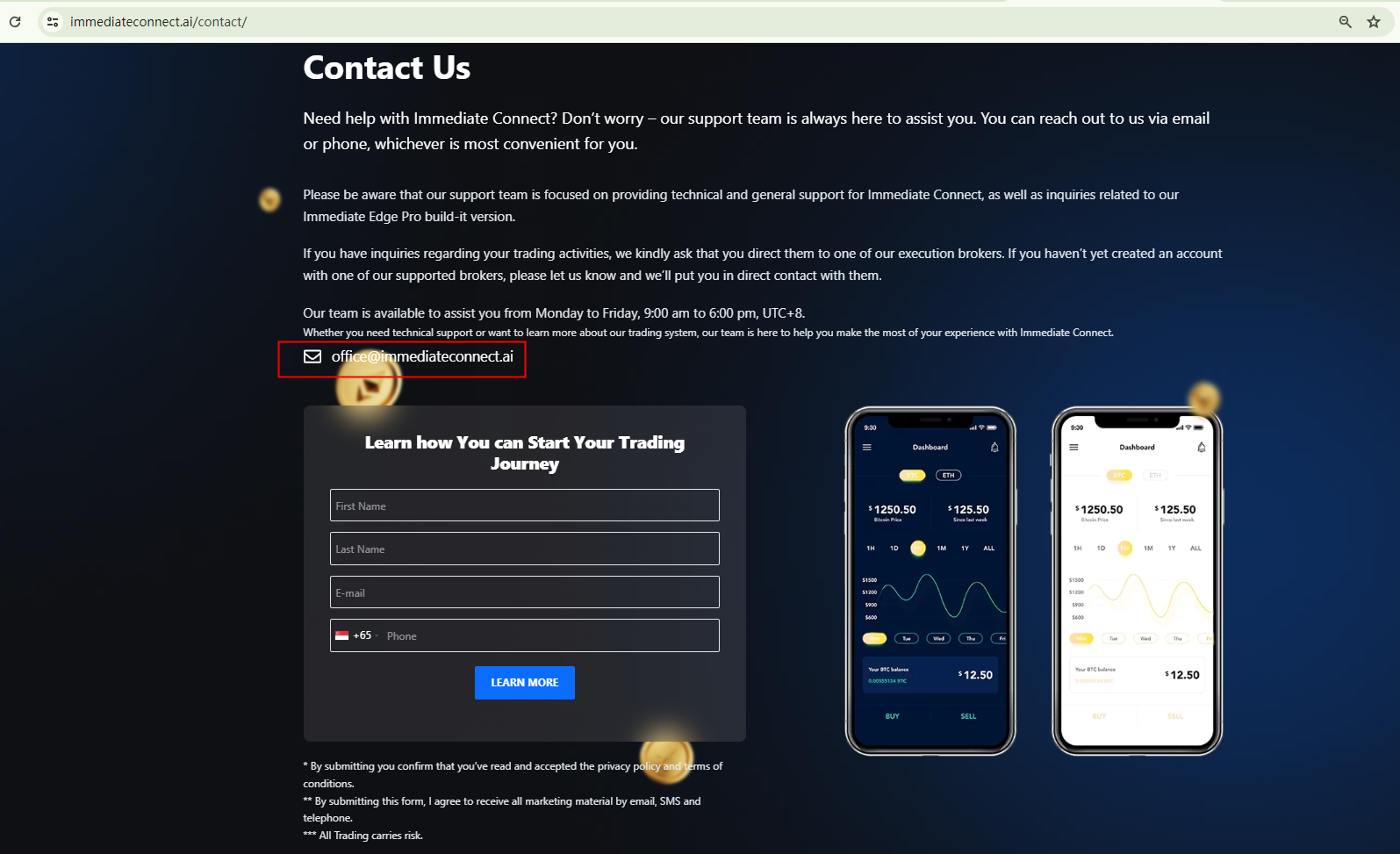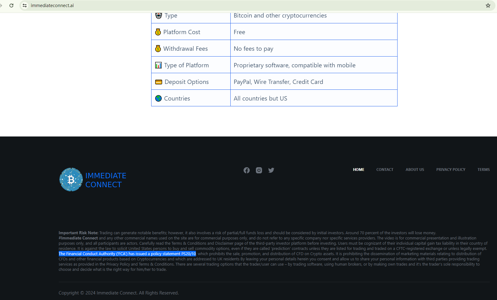 Immediate Connect, a financial services provider, operates without the necessary authorization. Its website conspicuously lacks crucial information about its regulatory status. Although the Financial Conduct Authority (FCA) is mentioned in its disclaimer, presumably to convey an aura of authenticity and regulatory compliance, there is no evidence to suggest that it is licensed by the FCA.The Contact page of the website only lists an email address for communication, a common red flag for fraudulent activities. Fraudsters often hide their actual location and contact details, maintaining control over communication. This strategy makes it easier for them to sever ties with customers and evade financial regulators.Further raising suspicions, the Federal Financial Supervisory Authority (BaFin) has expressed concerns about the unidentified operators of the immediateconnect.ai website. They are suspected of offering financial and investment services to consumers without the required authorization.In summary, Immediate Connect is not regulated by any governing body, making it a high-risk entity for investors. Without legal protections in place, funds entrusted to it are not safeguarded. Therefore, Immediate Connect appears to be a potential scam.