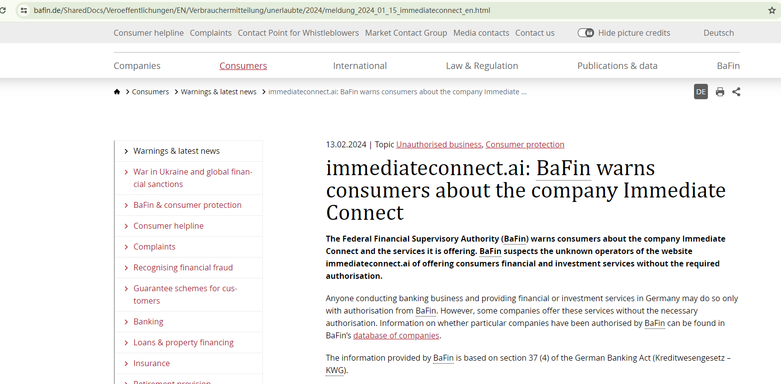 Further raising suspicions, the Federal Financial Supervisory Authority (BaFin) has expressed concerns about the unidentified operators of the immediateconnect.ai website. They are suspected of offering financial and investment services to consumers without the required authorization.