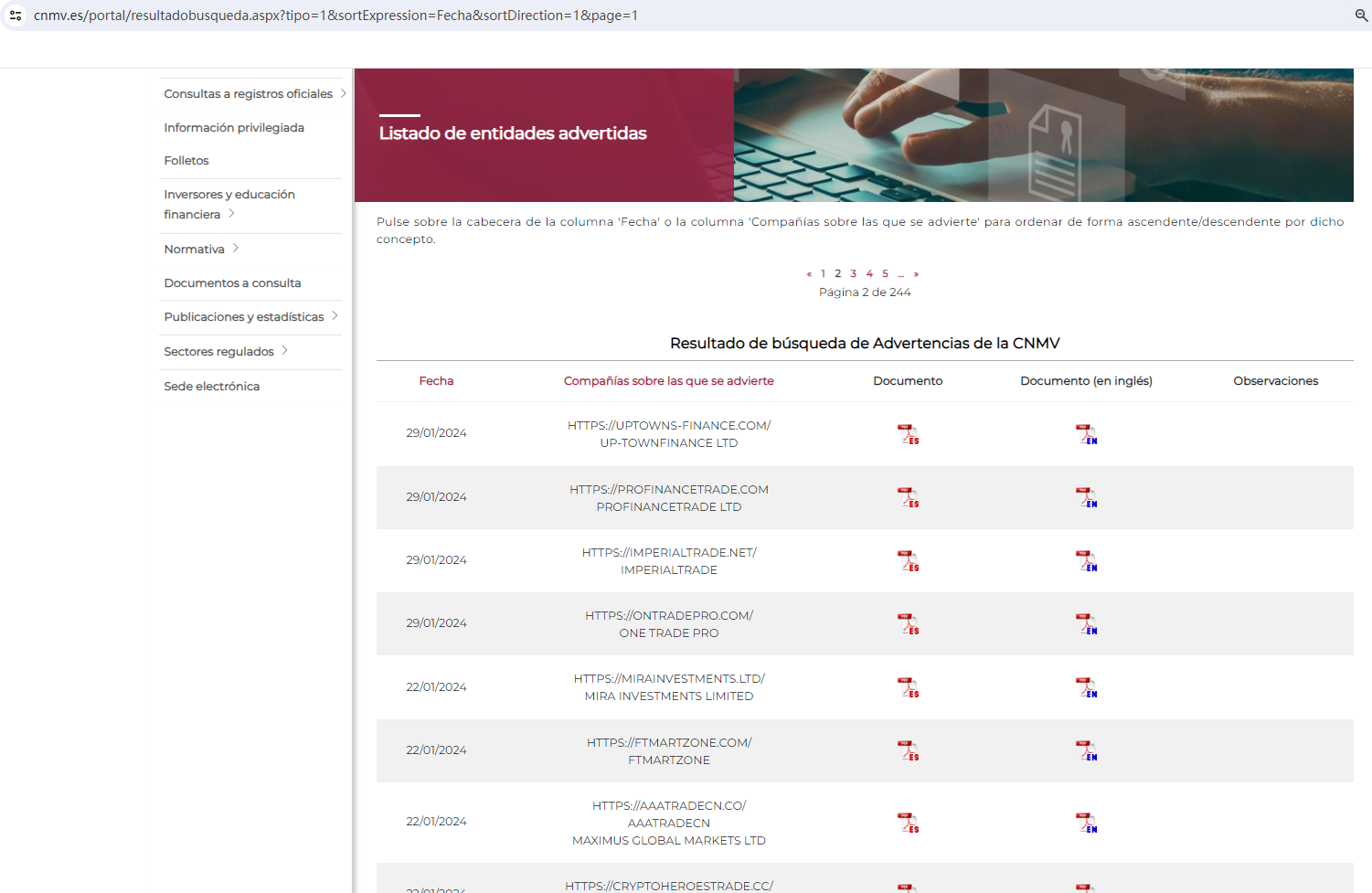 The Comisión Nacional del Mercado de Valores (CNMV) added IMPERIALTRADE to its warning list for providing investment services without authorization.