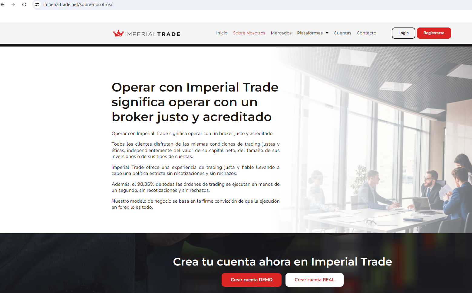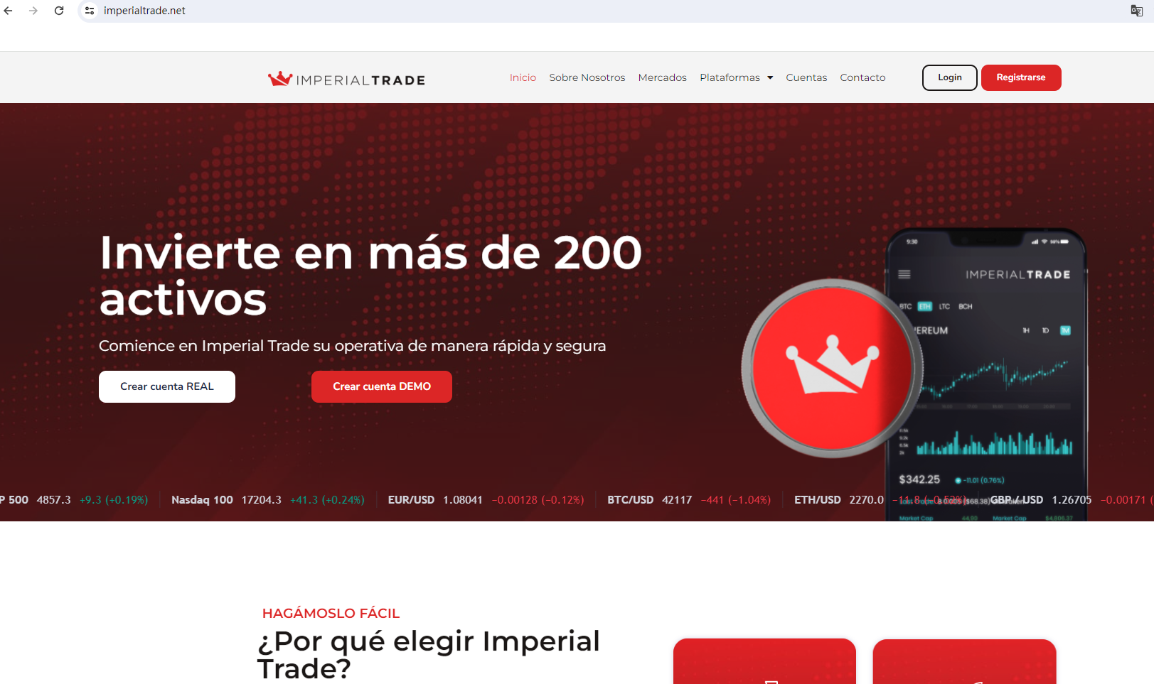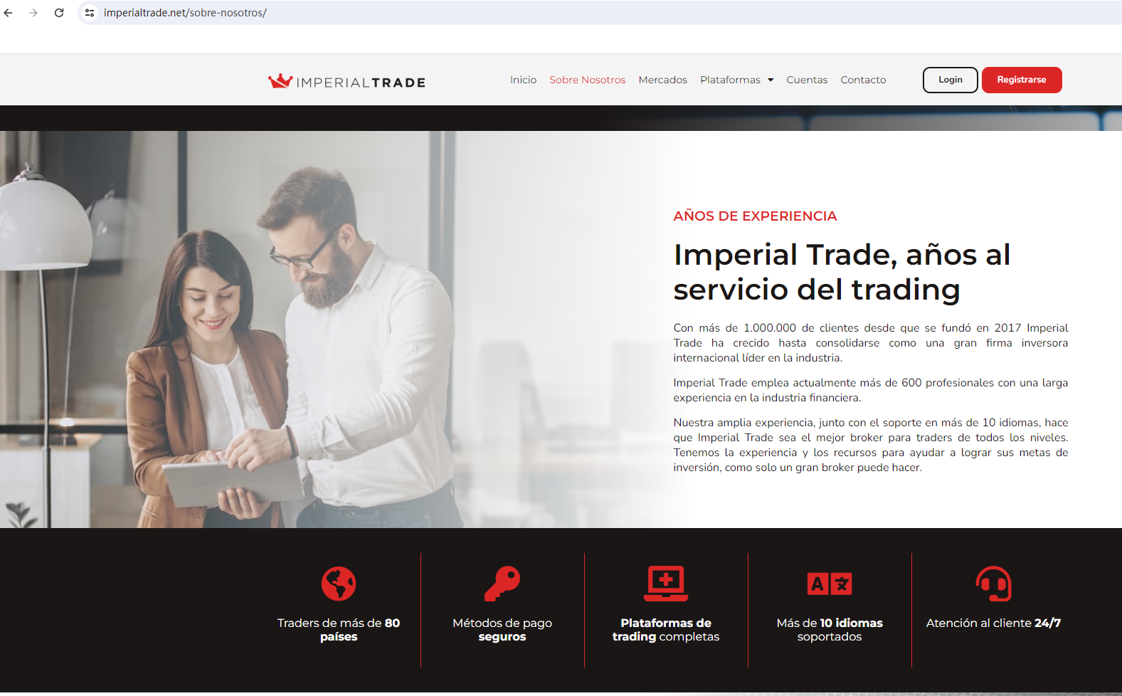 IMPERIALTRADE claims to be a reliable company without presenting any information about its regulation or contact. The lack of such important information may be a distinct signal of an unlicensed broker, as regulated companies always present their accreditations and licenses in a prominent position. It is a red flag. The Comisión Nacional del Mercado de Valores (CNMV) added IMPERIALTRADE to its warning list for providing investment services without authorization.The truth is that IMPERIALTRADE is not regulated by any regulators. Letting it hold or control investors' money is unsafe, and the money can not be protected by any laws.IMPERIALTRADE is a scam.