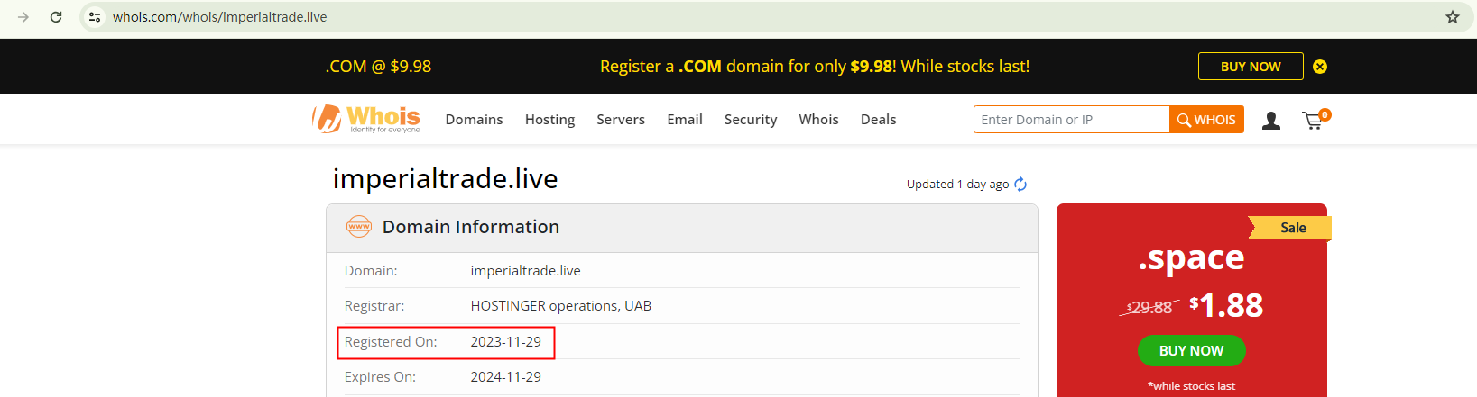 Further compounding these concerns is the fact that the domain name imperialtrade.live was only registered towards the end of 2023. The recent establishment of its domain name is another warning sign, as fraudulent websites often have short lifespans. They frequently shut down and disappear once their illicit activities are detected by financial regulators, only to resurface under a new domain or brand name.