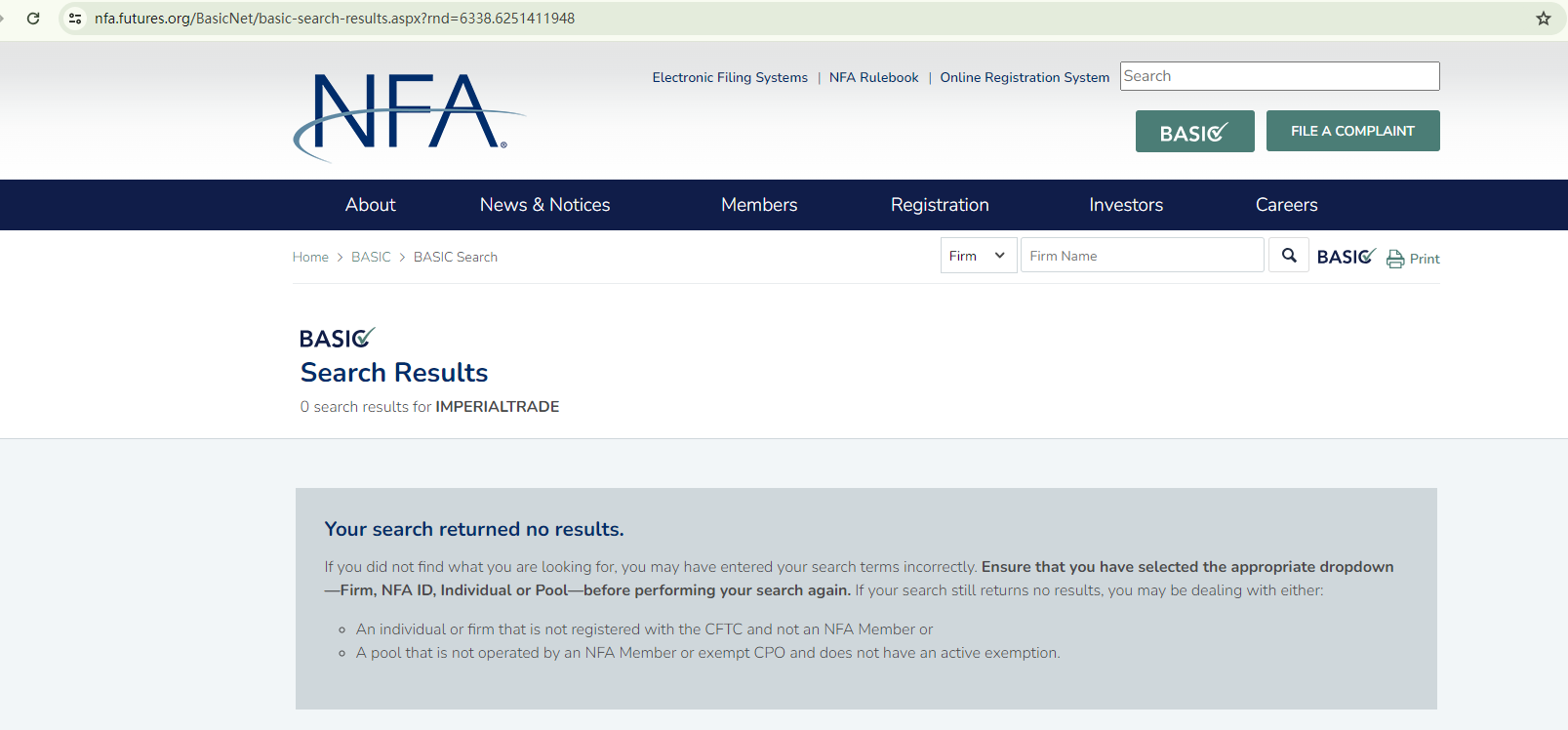We have conducted an exhaustive investigation into this platform. Our search for this entity in the registers of the CFTC and SEC yielded no matching records. Furthermore, it is mandatory for such operations to be registered as a member of the National Futures Association (NFA), but this platform is not registered and therefore not subject to NFA's oversight.