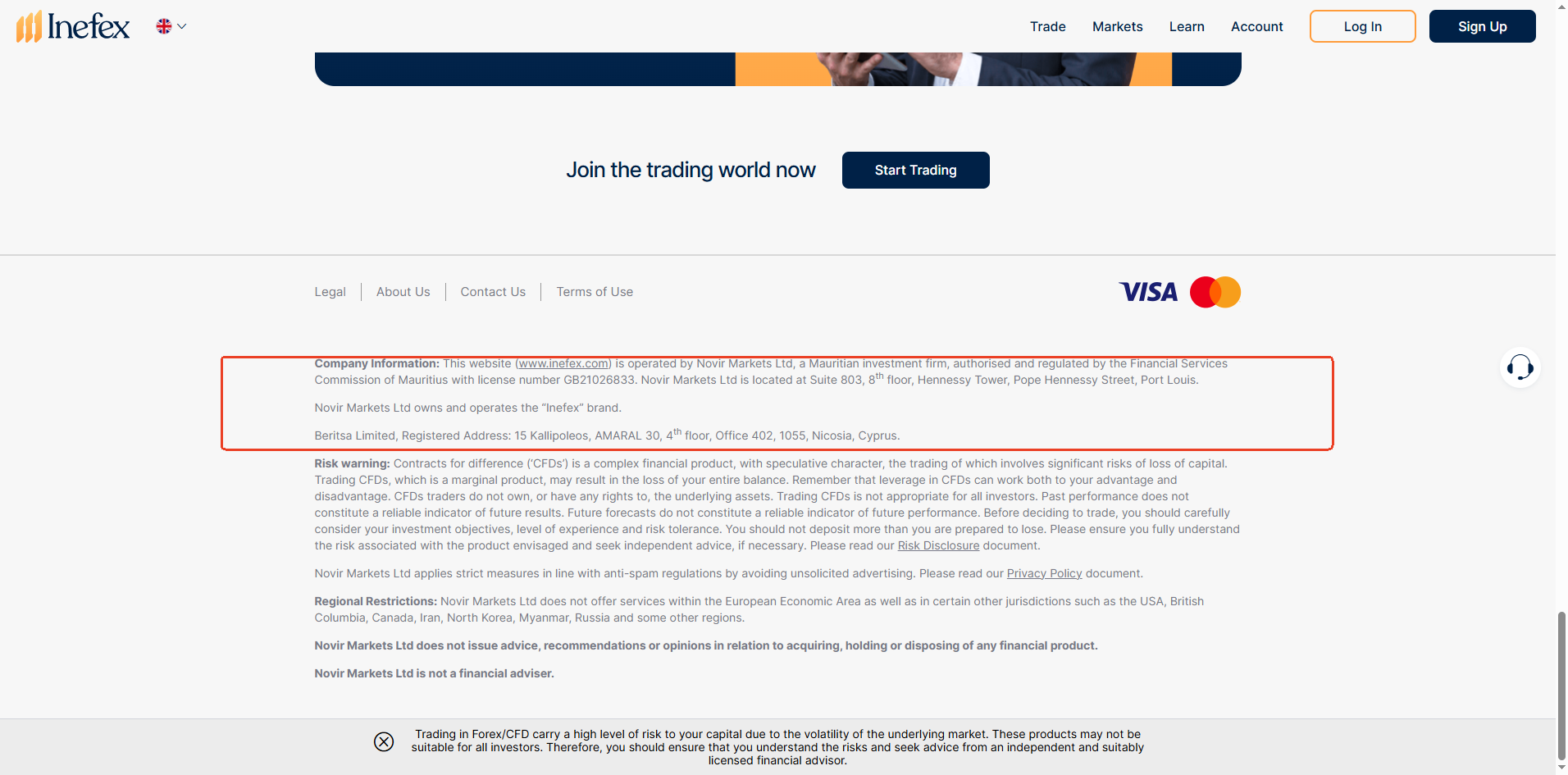 Inefex claims to be a brand of Novir Markets Ltd, regulated by the Financial Services Commission (FSC) of Mauritius. However, the domain name associated with the FSC-registered entity does not match Inefex’s website, and we are unable to verify that Inefex is genuinely operated by this licensed company. Due to the risk of misrepresentation or unauthorized use of regulatory information, we classify Inefex as a suspected fraudulent broker.