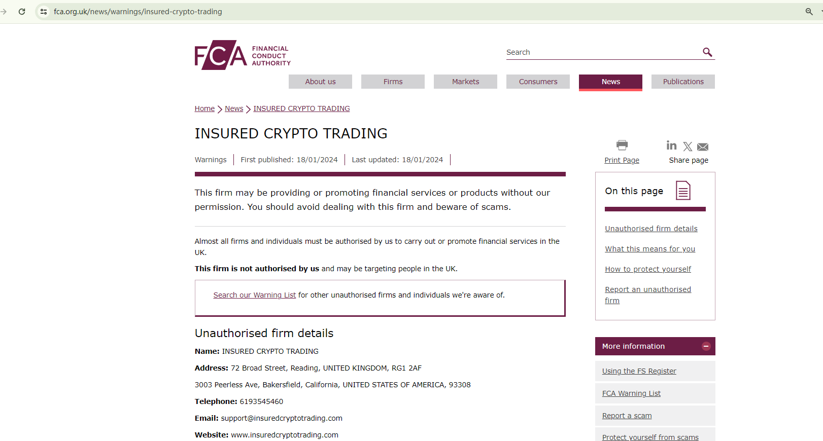 INSURED CRYPTO TRADING claims to be regulated by the Financial Conduct Authority (FCA) and the Cyprus Securities and Exchange Commission (CySEC). However, the FCA issued a warning about it, refuting that claim, and a search for this company on the CySEC register yielded no matching entries.What's more, INSURED CRYPTO TRADING purports to have an office in the US. For it to be a legitimate forex broker there, it is required to be registered as a member of the National Futures Association (NFA). But, it failed.In essence, INSURED CRYPTO TRADING is not regulated by any governing body. Entrusting it with investors' funds is highly risky, as there are no legal protections in place to safeguard the funds.INSURED CRYPTO TRADING appears to be a scam.