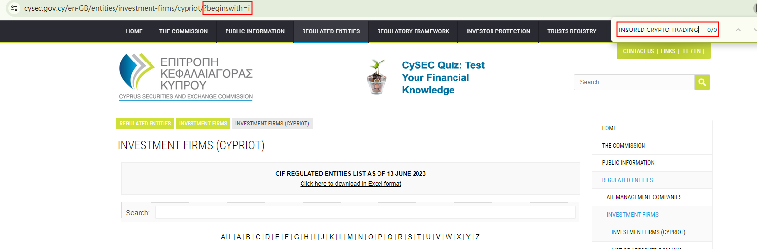 INSURED CRYPTO TRADING claims to be regulated by the Financial Conduct Authority (FCA) and the Cyprus Securities and Exchange Commission (CySEC). However, the FCA issued a warning about it, refuting that claim, and a search for this company on the CySEC register yielded no matching entries.