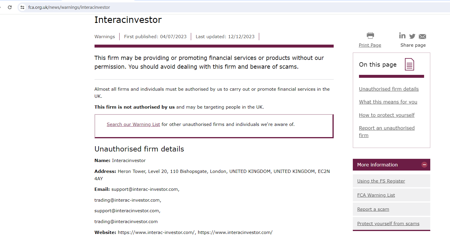 Since INTERACINVESTOR is still in business to steal money from unsuspecting investors, FCA updates its warning against the platform with more details about the unauthorized firm and cautions the public to stay away from it once again. You may visit: https://www.fca.org.uk/news/warnings/interacinvestor