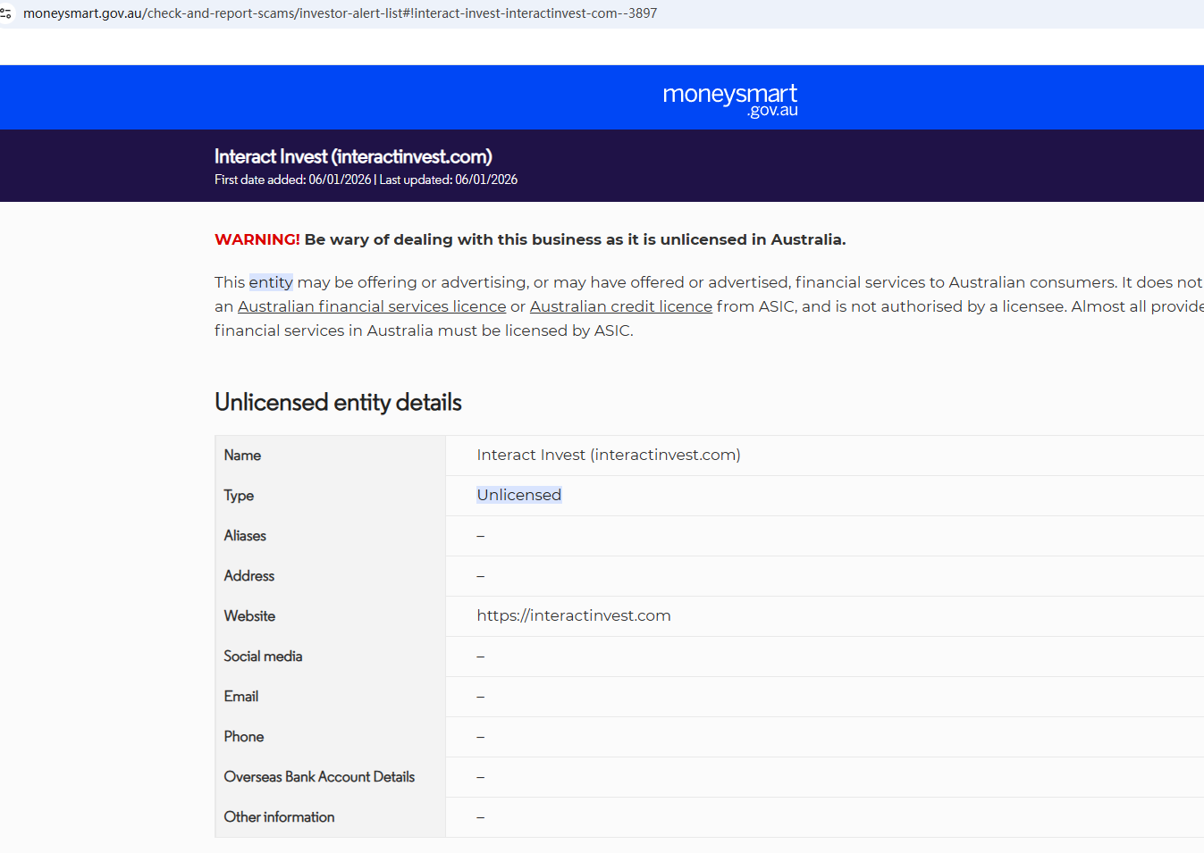 On Jan 6, 2026, the Australian Securities & Investments Commission (ASIC) issued a warning against Interact Invest, believing this company might be providing financial services or products without proper authorization. https://moneysmart.gov.au/check-and-report-scams/investor-alert-list#!interact-invest-interactinvest-com--3897