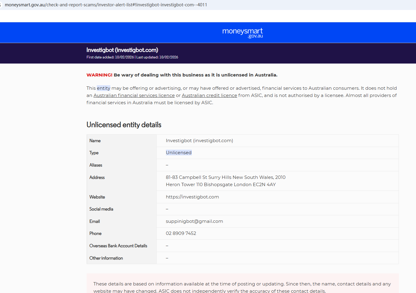 On Feb 10, 2026, the Australian Securities & Investments Commission (ASIC) issued a warning against Investigbot, believing this company might be providing financial services or products without proper authorization. https://moneysmart.gov.au/check-and-report-scams/investor-alert-list#!investigbot-investigbot-com--4011