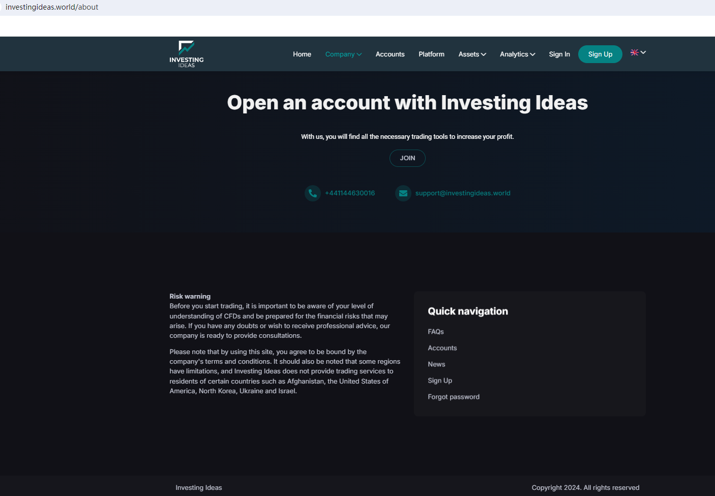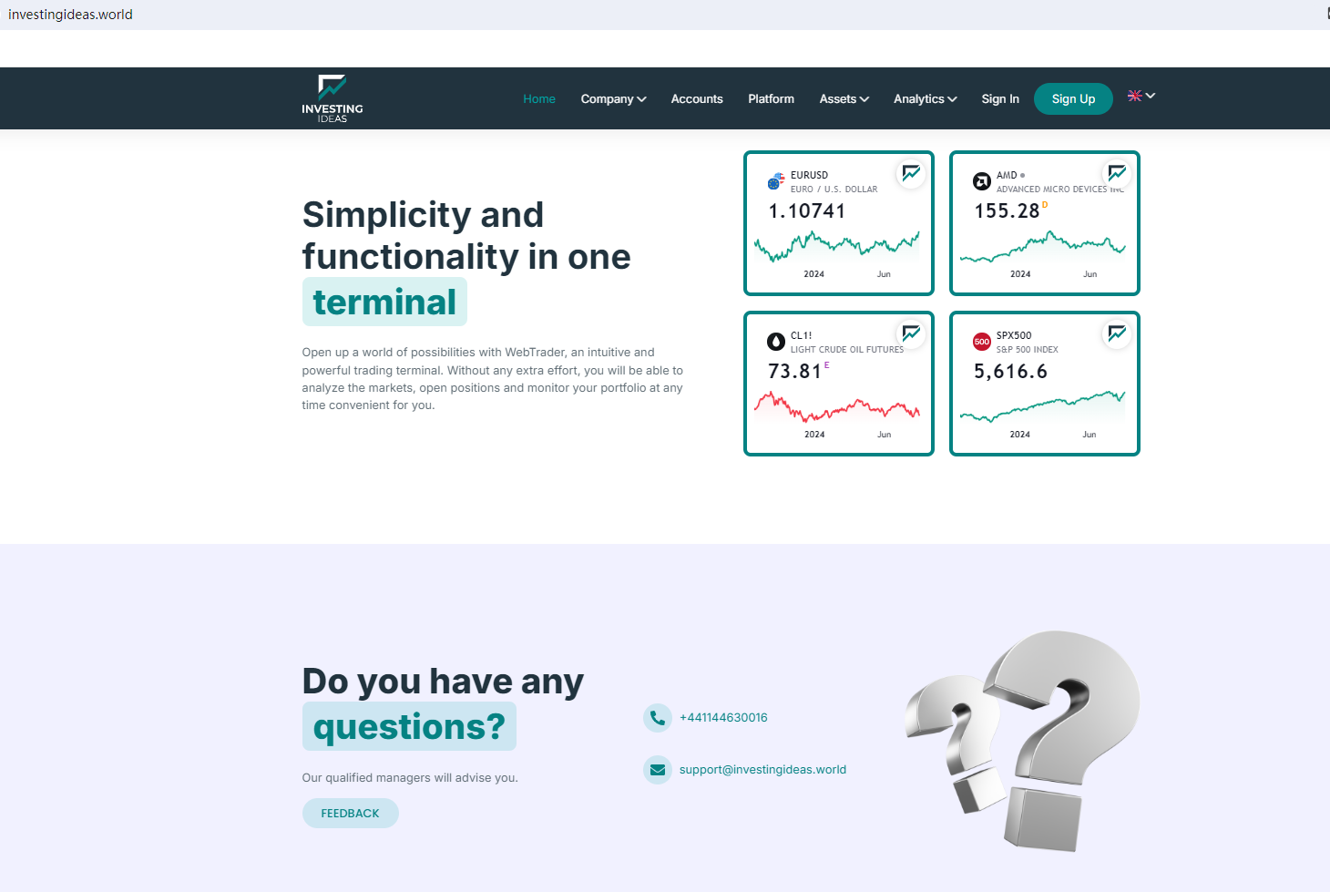Investing Ideas doesn't provide any licensing details to support its legitimacy. Typically, regulated brokers display such information on their website to demonstrate regulatory compliance. Additionally, the broker does not disclose its location, leaving investors unaware of their real location and hindering the ability to find them if any issues arise.