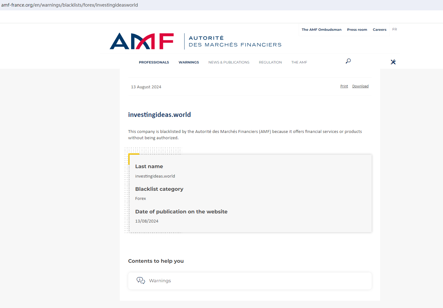 More critically, the Autorité des Marchés Financiers (AMF) has added Investing Ideas to its warning list for being an unauthorized company engaging in forex activities.