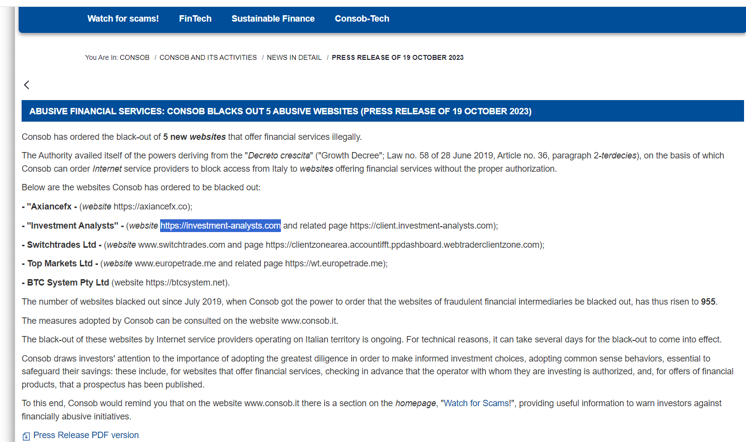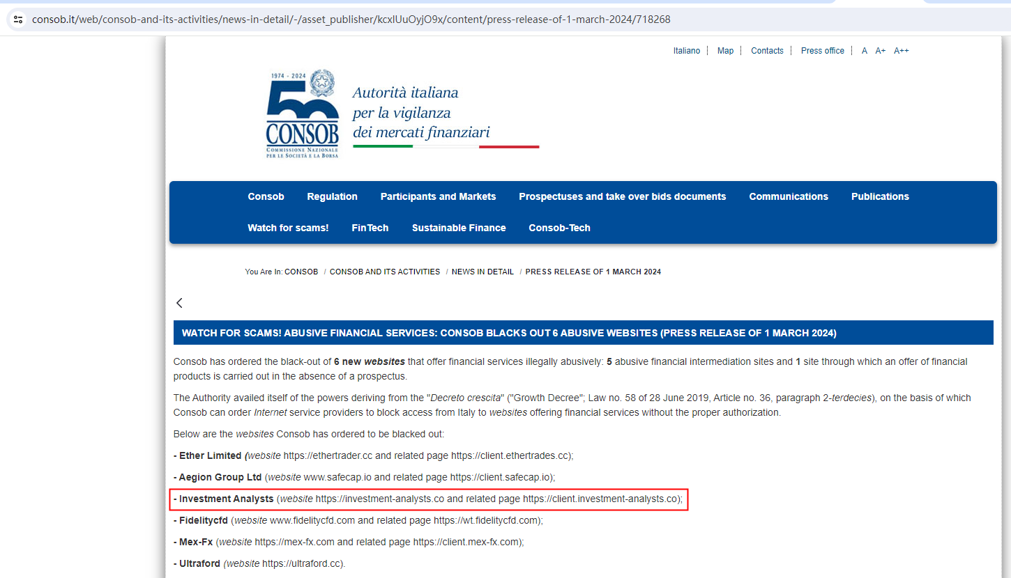 The Commissione Nazionale per le Società e la Borsa (CONSOB) issued a warning that Investment Analysts was providing finacial services or products without authorisation.