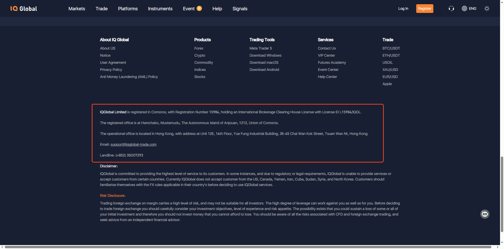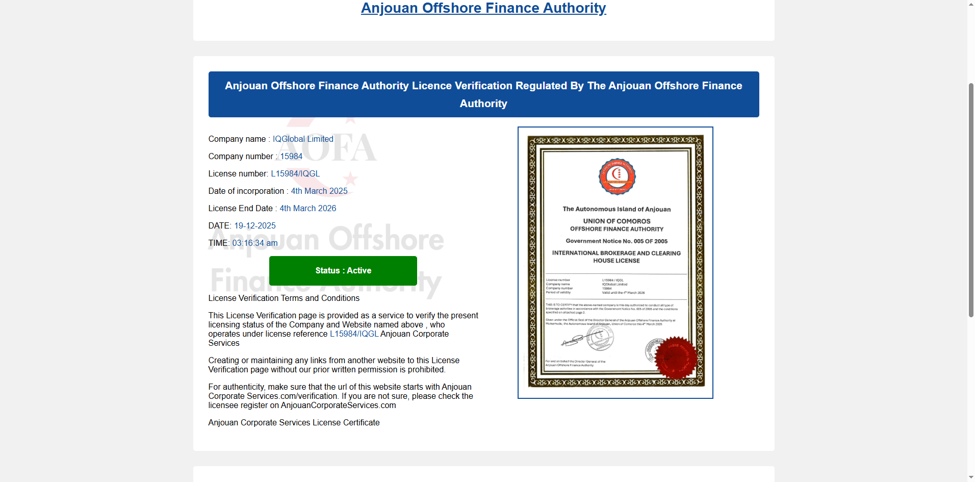 IQ Global claims to be regulated by the Anjouan Offshore Finance Authority (AOFA) in Comoros. However, the AOFA is an offshore regulatory body that is known for its weak oversight and lack of international recognition. The jurisdiction offers limited investor protection, and its regulatory framework is generally considered to be unreliable by global financial standards.