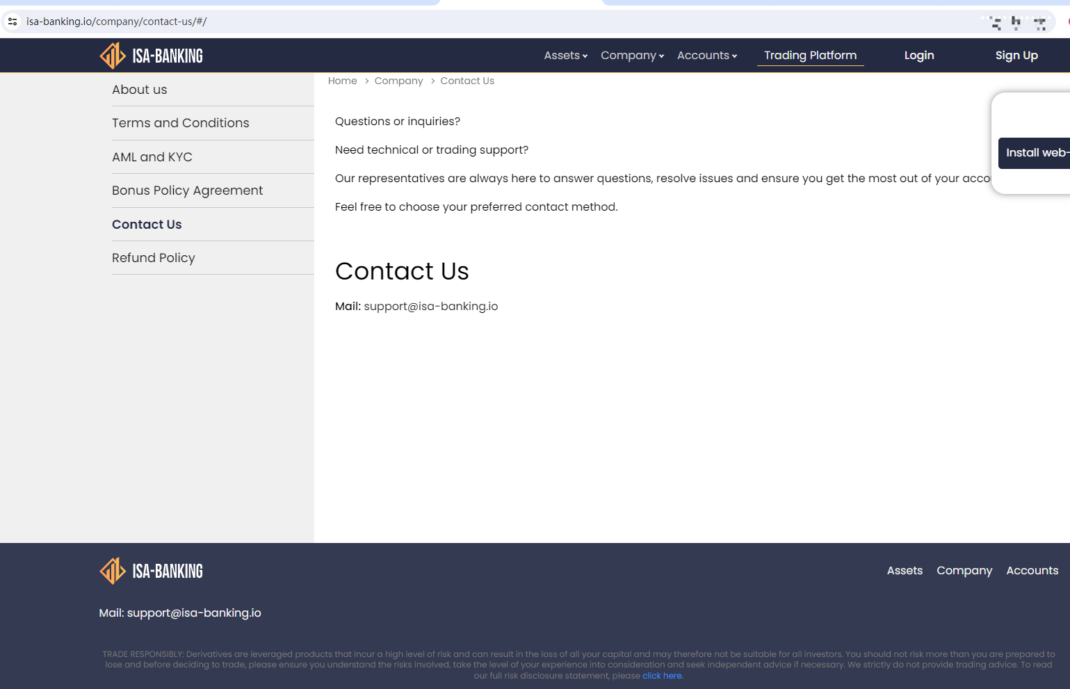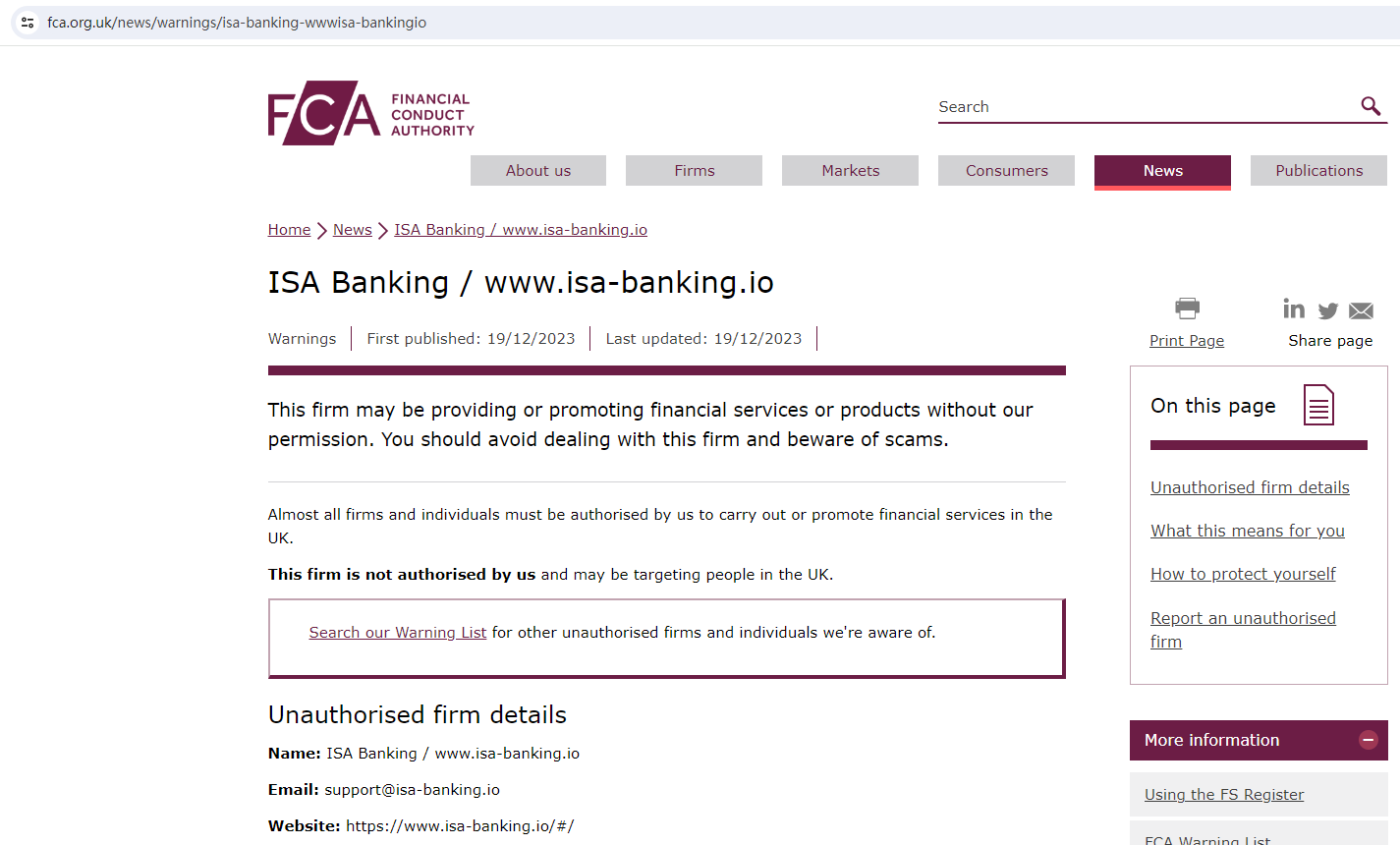 ANSWER No, Isa Banking appears to be operating in the absence of any required licenses. It is an unregulated forex broker that poses significant risks.Despite the fact that its domain name, isa-banking.io, was first registered in August 2023, its website blatantly claims that it has been providing financial services for over 20 years. This contradiction is a red flag. In addition, we went through its website and hadn't found any information regarding its regulatory status. The absence of such information can be considered a significant scam indicator either. What's more, it is crucial to note the the British financial watchdog, the Financial Conduct Authority (FCA) has issued a warning about Isa Banking, identifying it as an unauthorized firm in the UK and publishing its details to advise the public to stay away from it.Therefore, it is highly risky engaging with Isa Banking, and investors may fall victim to fraud and identity theft if they do so. We strongly suggest traders stay away from such unlicensed platforms and only choose those fully regulated ones with solid reputations.