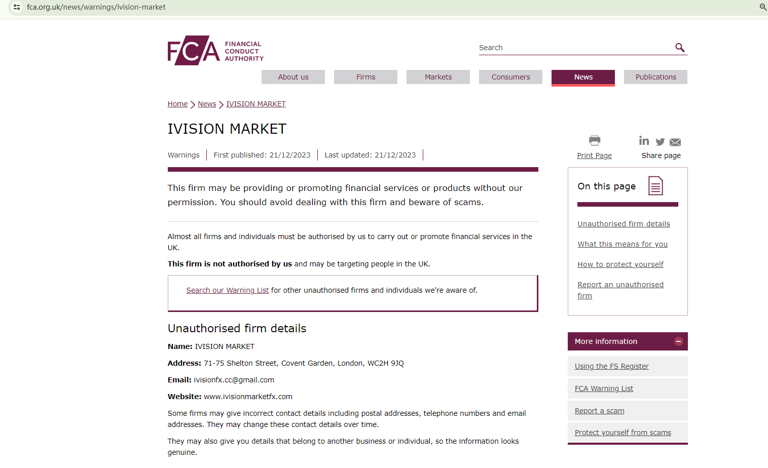 IVISION claims to be regulated in the UK. However, the Financial Conduct Authority (FCA) has red-flagged it as an unauthorized firm illegally offering financial services in this country.