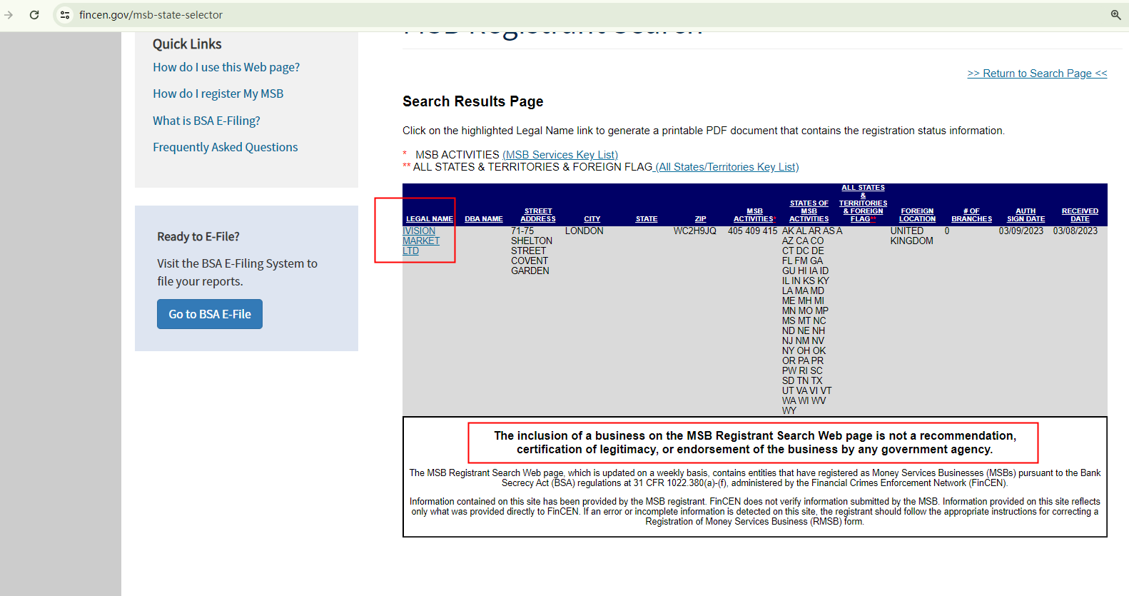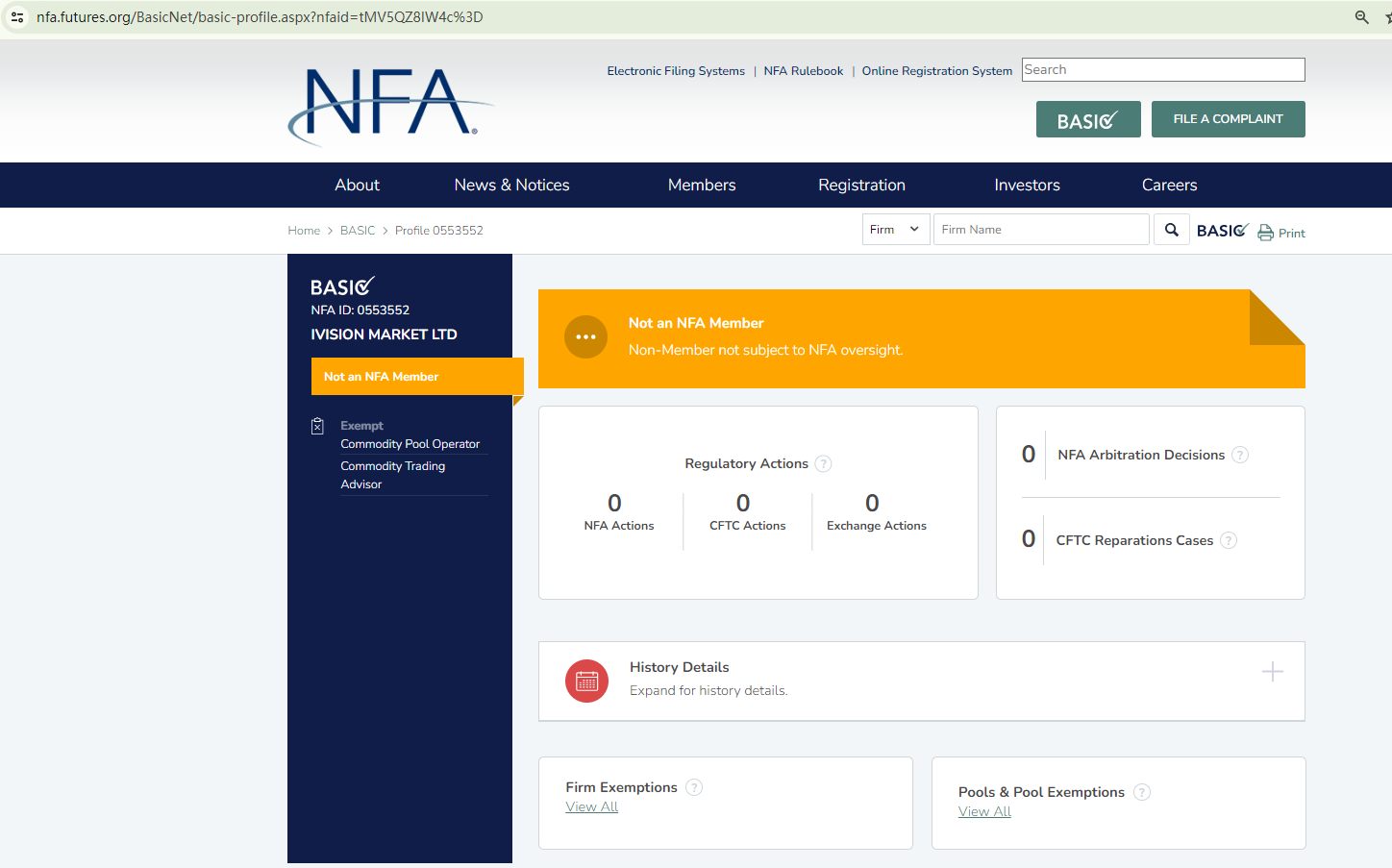 IVISION also claims to be regulated by the Financial Crimes Enforcement Network (FinCen) with MSB registration. While we found some matching entries in the MSB register, it is crucial to note that the registration is not a recommendation, certification of legitimacy, or endorsement of the business by any government agency. It doesn't equate to authorization or a license from a financial regulatory body. In addition, our search for this company in the National Futures Association (NFA) registry suggested that it is not an NFA member and thus not supervised by the authority.