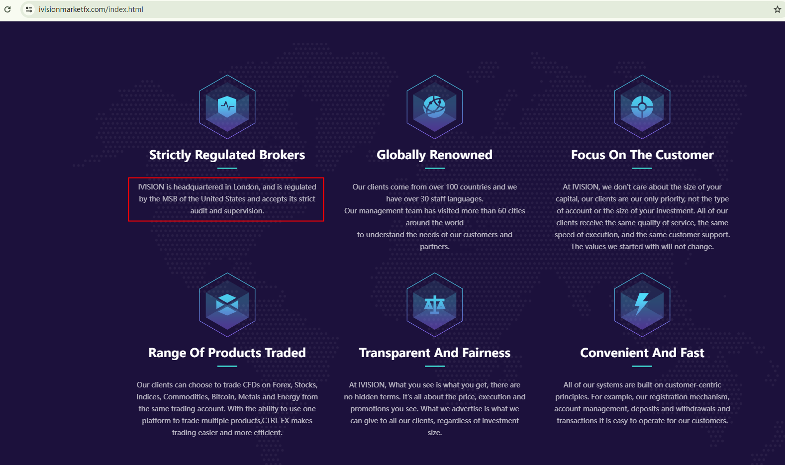 IVISION claims to be regulated in the UK. However, the Financial Conduct Authority (FCA) has red-flagged it as an unauthorized firm illegally offering financial services in this country.IVISION also claims to be regulated by the Financial Crimes Enforcement Network (FinCen) with MSB registration. While we found some matching entries in the MSB register, it is crucial to note that the registration is not a recommendation, certification of legitimacy, or endorsement of the business by any government agency. It doesn't equate to authorization or a license from a financial regulatory body. In addition, our search for this company in the National Futures Association (NFA) registry suggested that it is not an NFA member and thus not supervised by the authority.In essence, IVISION is not regulated by any governing body. Entrusting this broker with investors' funds is highly risky, as there are no legal protections in place to safeguard the funds.IVISION appears to be a scam.