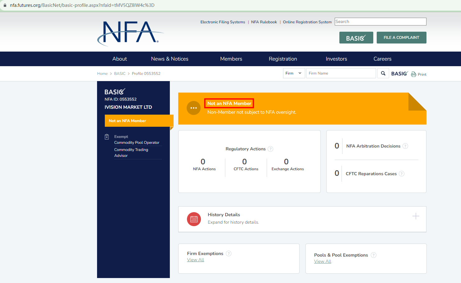 Likewise, the MSB registration is not a certification of legitimacy, or endorsement of the business by any government agency, as stated by the FinCEN (Financial Crimes Enforcement Network). As per the US regulation, forex brokers must be supervised by the Commodity Futures Trading Commission (CFTC) and the National Futures Association (NFA). Hence, such companies are required to be a member of the NFA. In the NFA BASIC, Ivision Market Ltd under ID 0553552 is not an NFA member and thus is not subject to NFA's oversight. This means its NFA ID is for tracking purposes only, not a license.