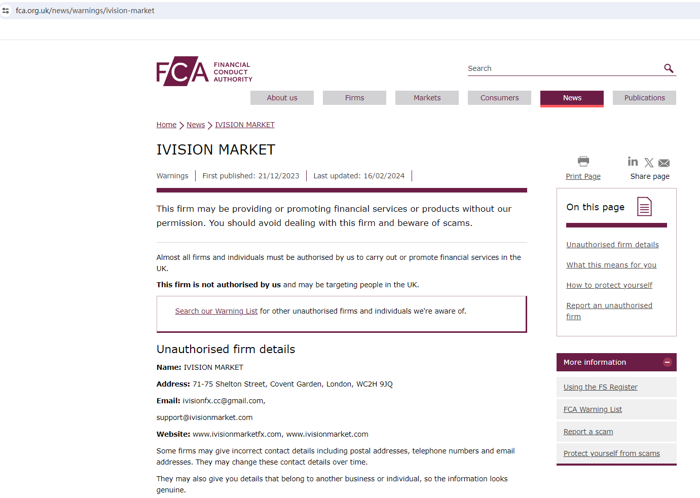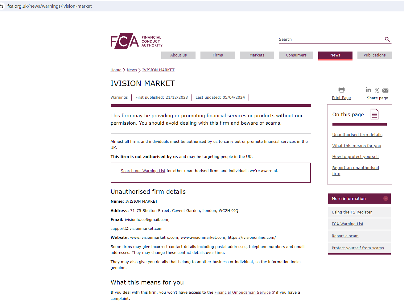 Ivision Market tries to build its credibility by claiming to have a physical address in the UK and providing this registration information, including a registration number (13573035) from the Companies House (CH), a NFA ID (0553552), and an MSB registration number (31000238442500) from FinCEN.However, it is mandatory for a forex broker in the UK to seek a license from the Financial Conduct Authority (FCA) and the mere registration with the CH doesn't mean being authorized to legally solicit investors in this country. Therefore, while we find a record matching its claim in the CH register, it is a result meaningless in supporting its legitimacy because it lacks authorization from the FCA.Likewise, the MSB registration is not a certification of legitimacy, or endorsement of the business by any government agency, as stated by the FinCEN (Financial Crimes Enforcement Network). As per the US regulation, forex brokers must be supervised by the Commodity Futures Trading Commission (CFTC) and the National Futures Association (NFA). Hence, such companies are required to be a member of the NFA. In the NFA BASIC, Ivision Market Ltd under ID 0553552 is not an NFA member and thus is not subject to NFA's oversight. This means its NFA ID is for tracking purposes only, not a license.In essence, Ivision Market is not regulated by any governing body. Entrusting this broker with investors' funds is highly risky, as there are no legal protections in place to safeguard the funds. Ivision Market is unequivocally a scam.