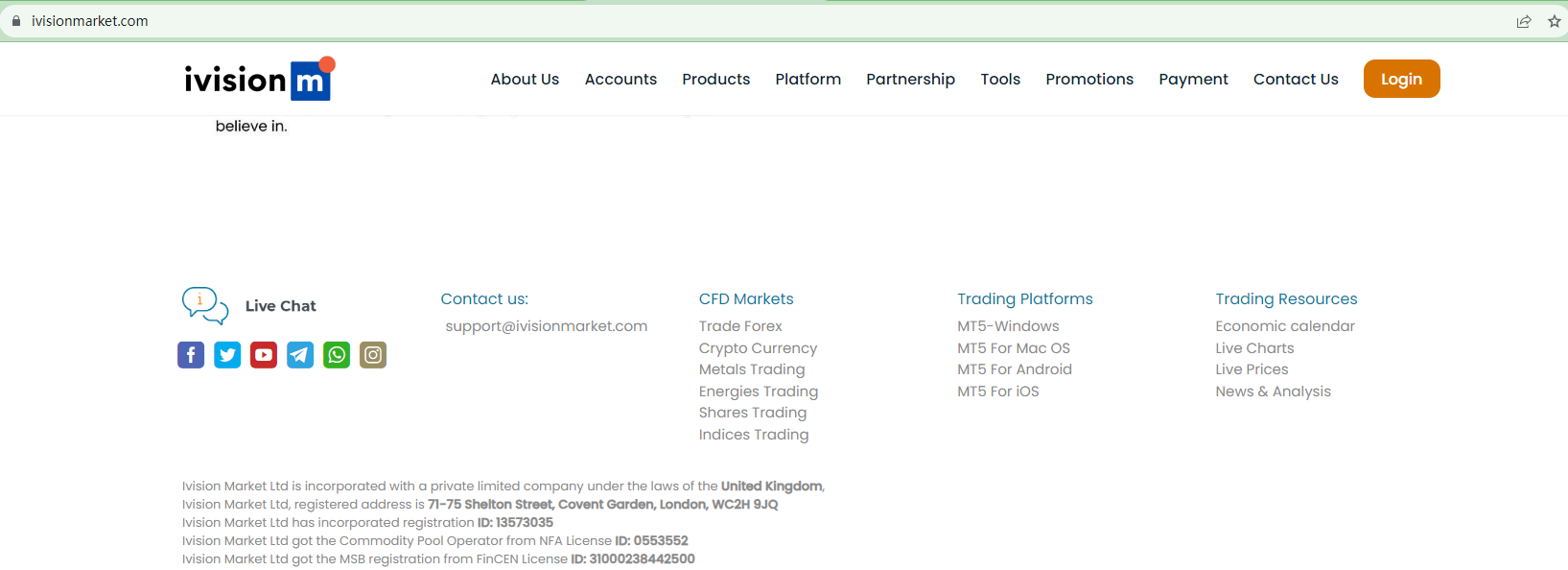 Ivision Market tries to build its credibility by claiming to have a physical address in the UK and providing this registration information, including a registration number (13573035) from the Companies House (CH), a NFA ID (0553552), and an MSB registration number (31000238442500) from FinCEN.