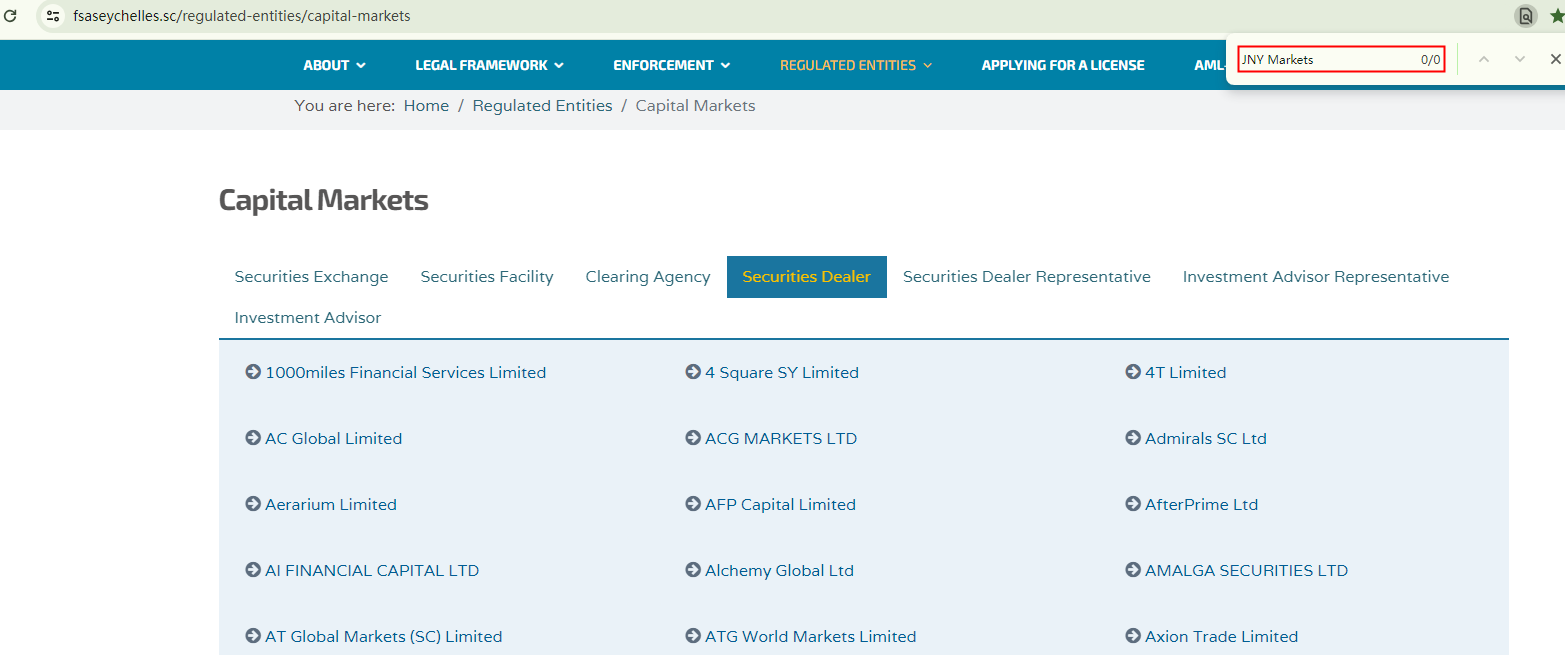 JNY Markets purports to be based in Seychelles and regulated by the Financial Services Authority of Seychelles (FSA Seychelles) under the registration number SD043.Nonetheless, our investigation into the FSA Seychelles register contradicts these claims, as we found no entries corresponding to this company. This discrepancy raises questions about the legitimacy of JNY Markets.In essence, JNY Markets is not regulated by any governing body. Entrusting it with investors' funds is highly risky, as there are no legal protections in place to safeguard the funds.JNY Markets appears to be a scam.
