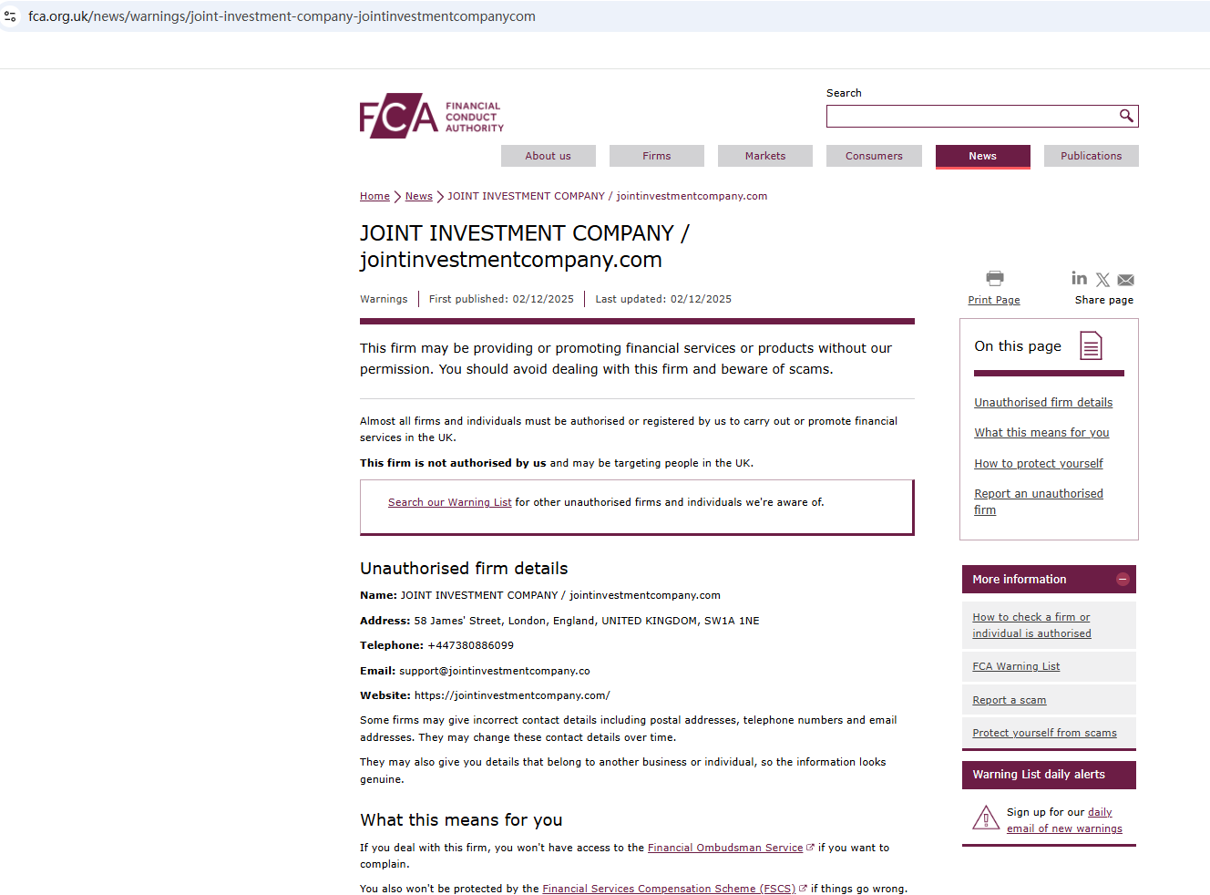 On Dec 1, 2025, the Financial Conduct Authority (FCA) issued a warning regarding JOINT INVESTMENT COMPANY, suspecting that this company may be offering financial services or products without the necessary authorization. https://www.fca.org.uk/news/warnings/joint-investment-company-jointinvestmentcompanycom