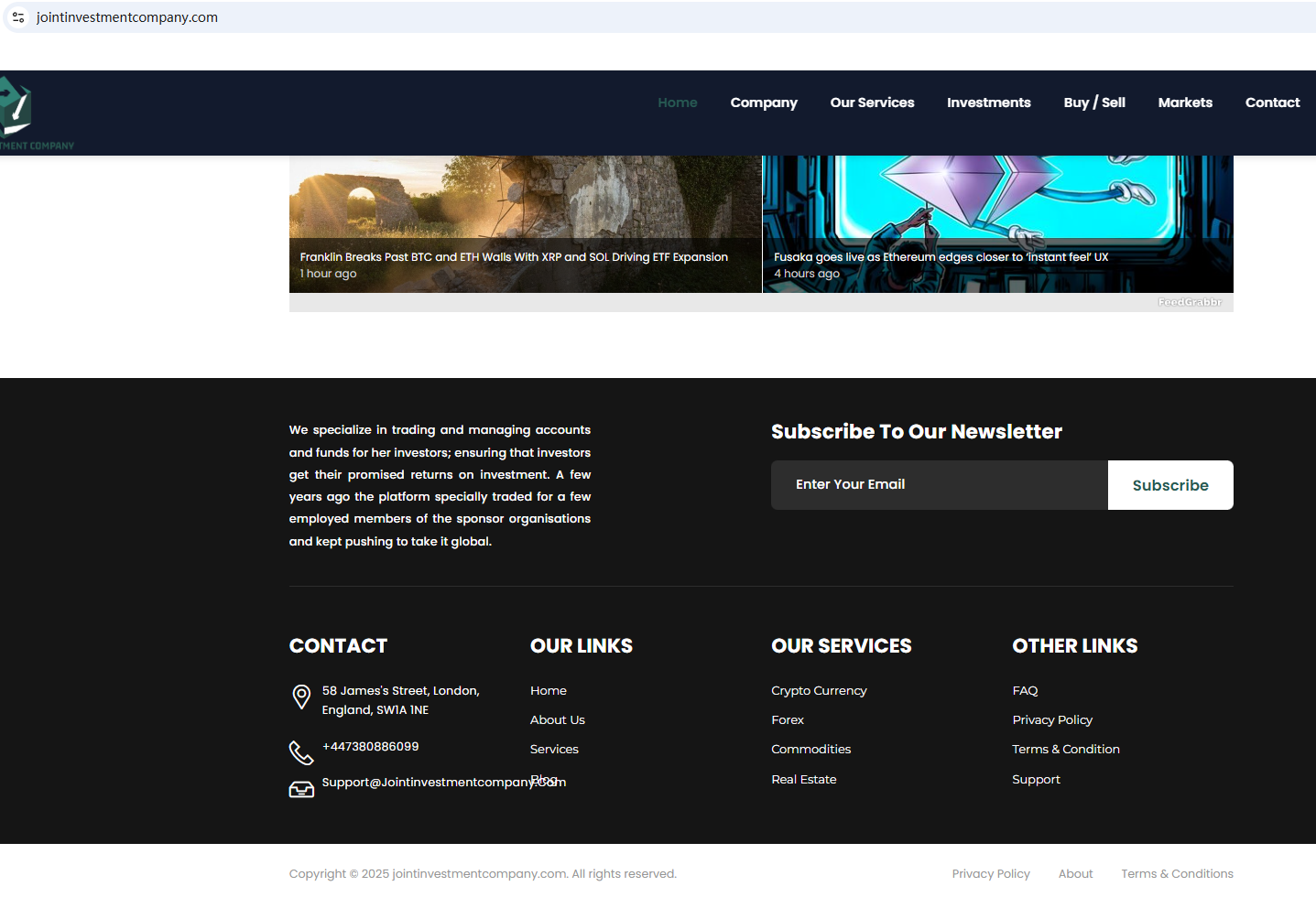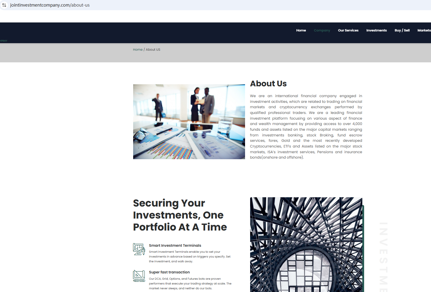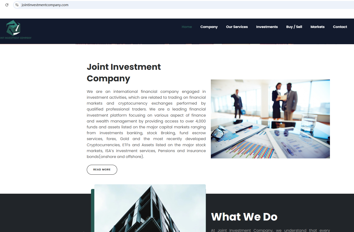 According to its website, it claims to be a reliable company, but it doesn't display any valid regulatory information on its site, only stating that its office address is in the UK. Ironically, we found that the Financial Conduct Authority (FCA) issued a warning regarding JOINT INVESTMENT COMPANY, suspecting that this company may be offering financial services or products without the necessary authorization.