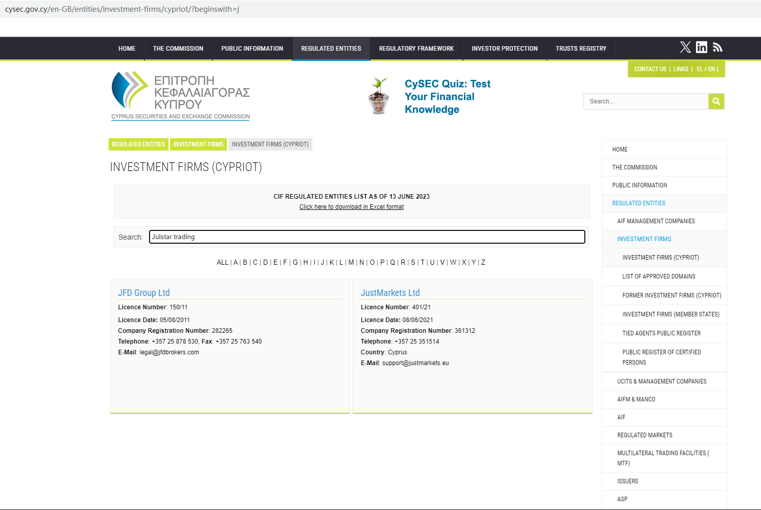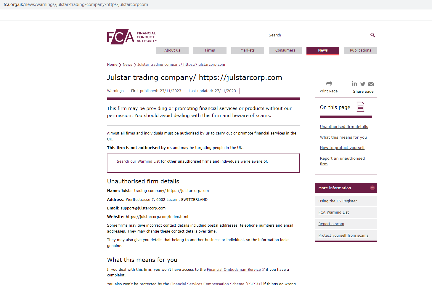 In addition, the United Kingdom Financial Conduct Authority (UK FCA) issued a warning that Julstar trading company was providing financial services or products in the UK without authorisation.