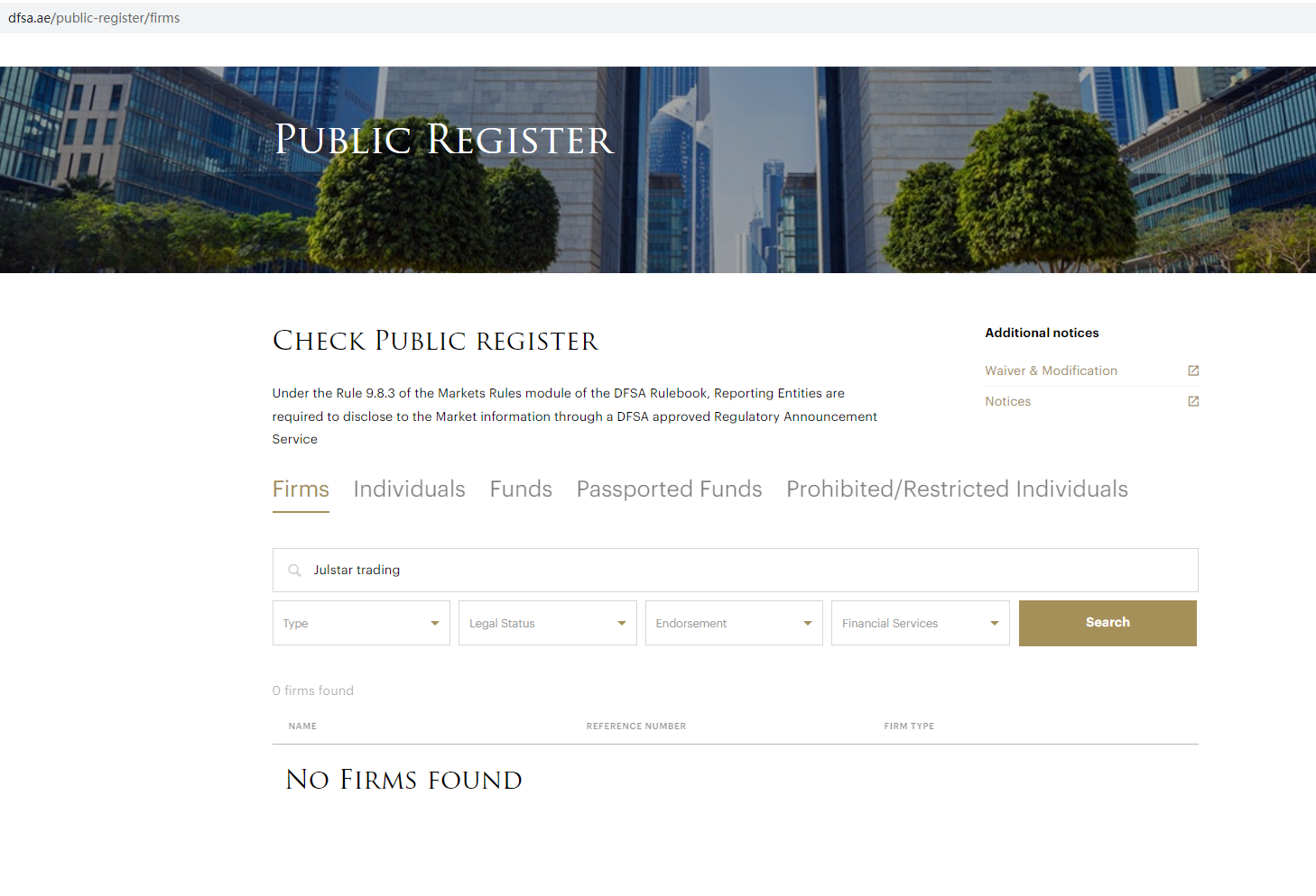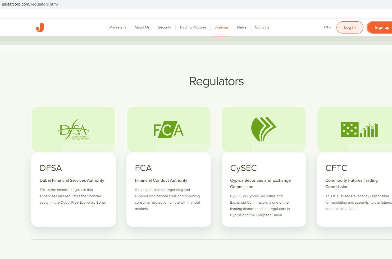 According to its website, it claims regulated by the Dubai Financial Services Authority (DFSA), Cyprus Securities and Exchange Commission (CySEC), Financial Conduct Association (FCA), and U.S. Commodity Futures Trading Commission (CFTC), but upon investigation, no matching information was found in these regulators.In addition, the United Kingdom Financial Conduct Authority (UK FCA) issued a warning that Julstar trading company was providing financial services or products in the UK without authorisation.The truth is that Julstar trading company is not regulated by any regulators. Letting it hold or control investors' money is unsafe and the money can not be protected by any laws.Therefore, Julstar trading company is a scam.