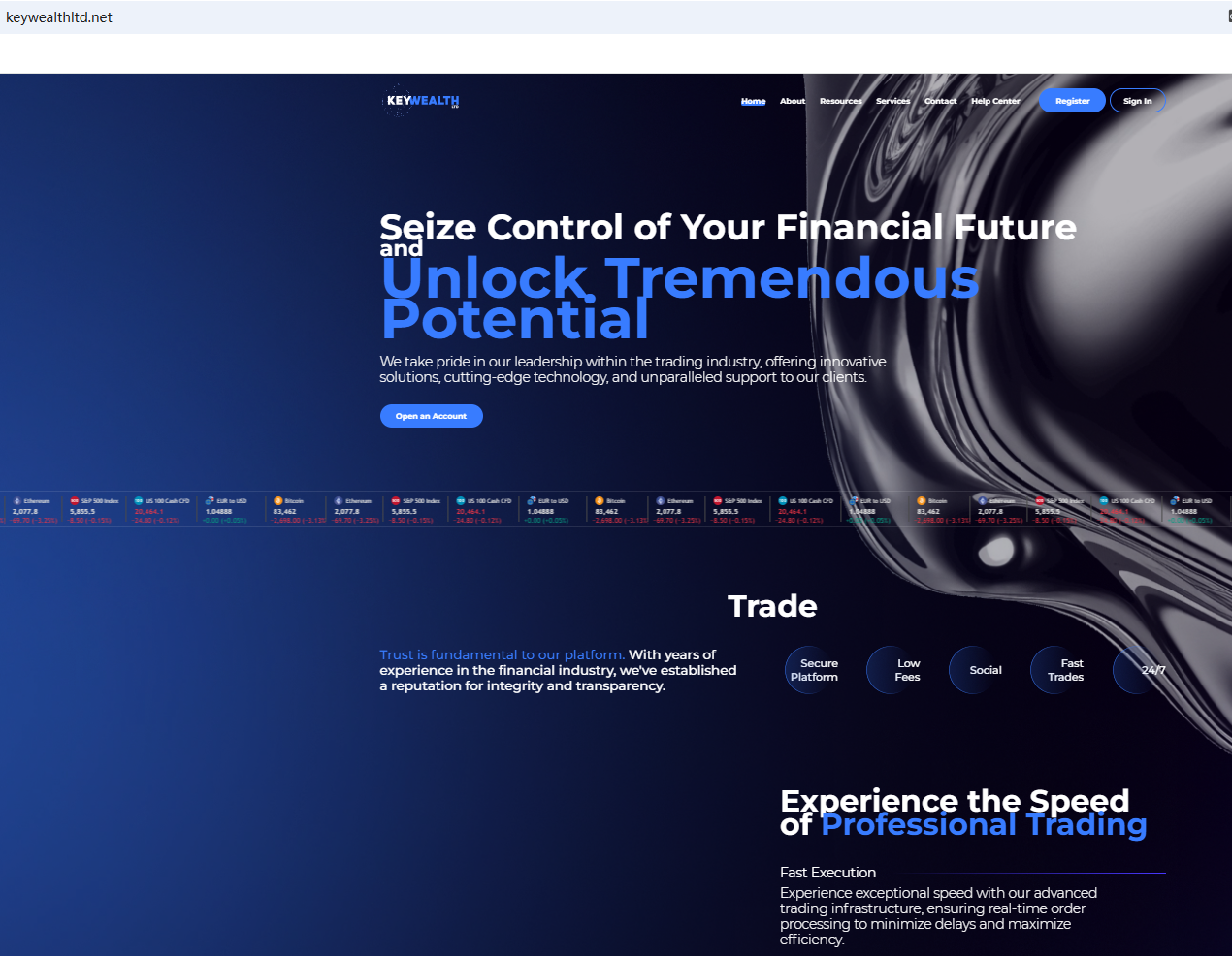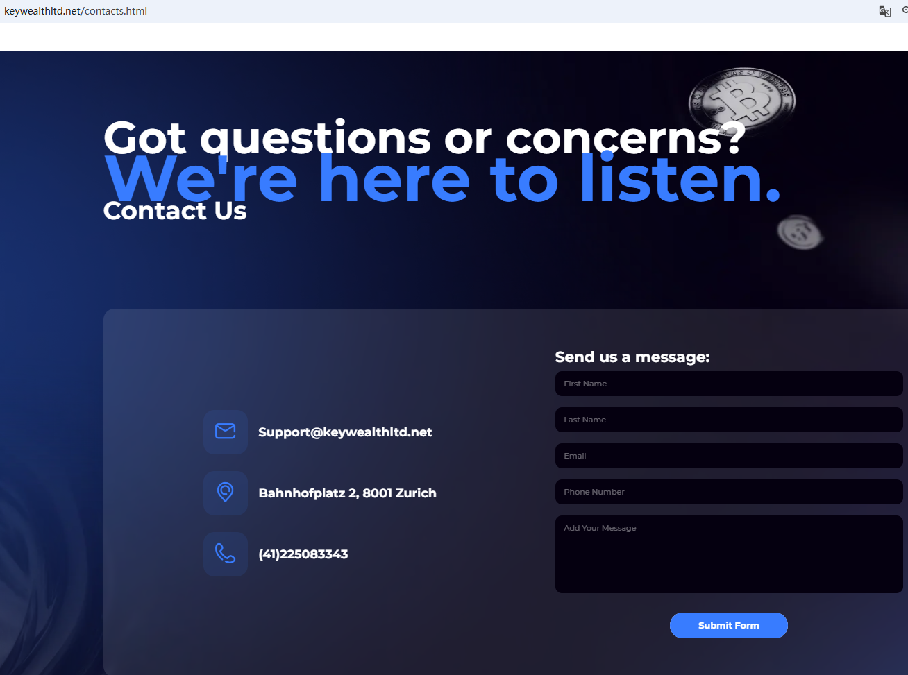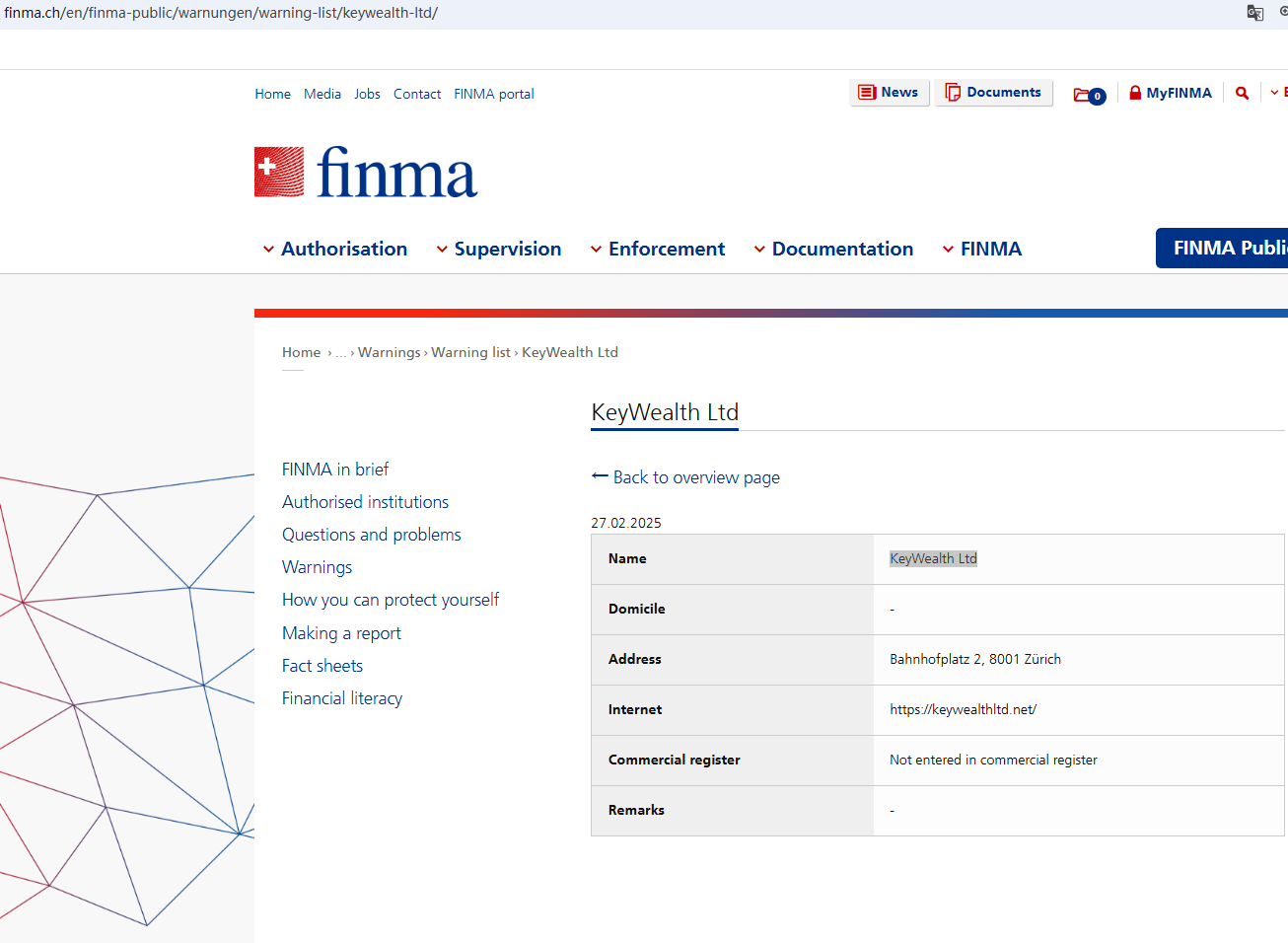 According to its website, it is located in Zurich. Upon investigation, we found that the Swiss Financial Market Supervisory Authority (FINMA) issued a warning against KeyWealth, stating that this broker is not entered in its commercial register.