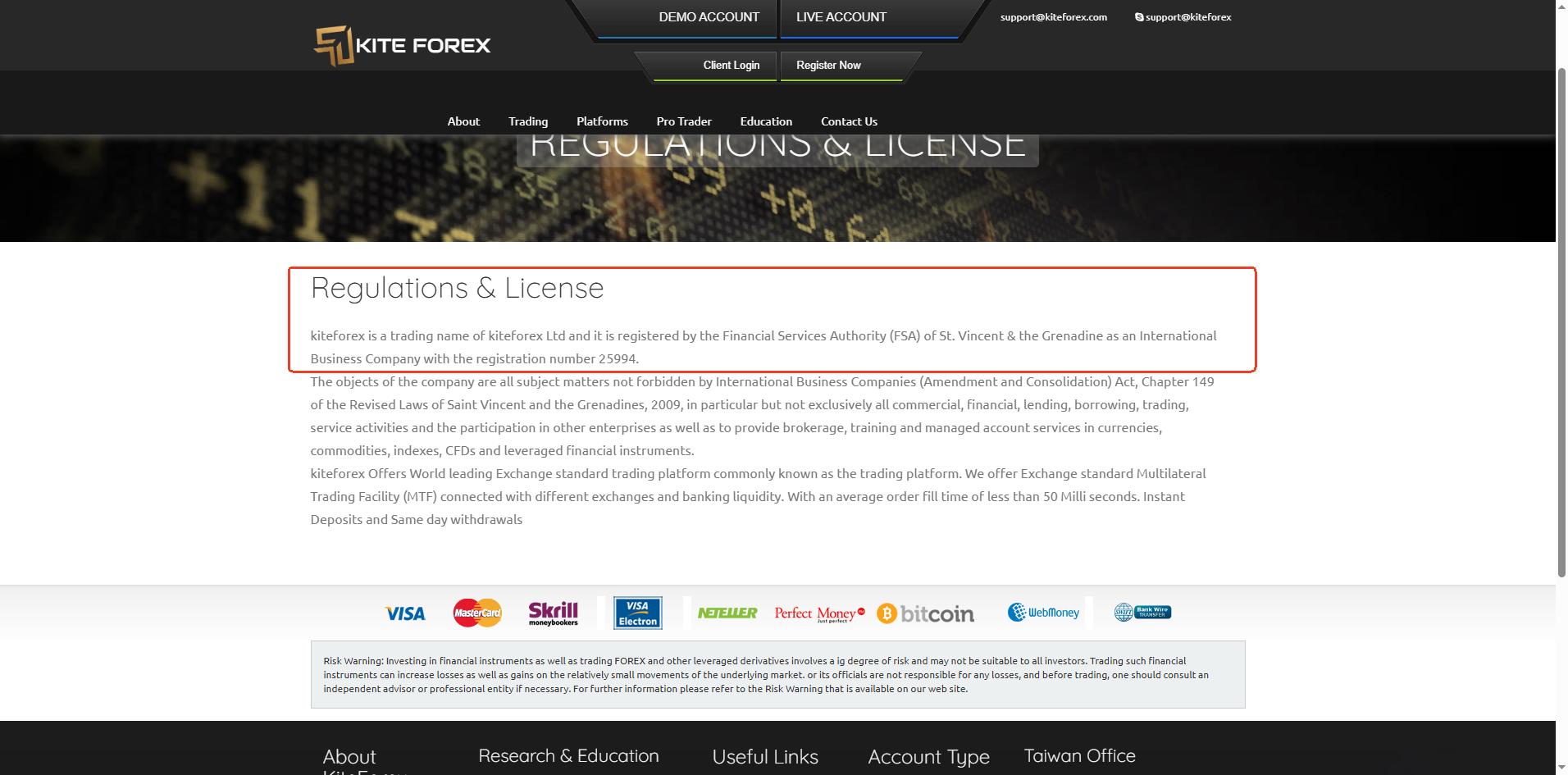Kite Forex's website states only that Kite Forex is a trading name of Kiteforex Ltd and claims registration with the Financial Services Authority (FSA) of St. Vincent and the Grenadines.