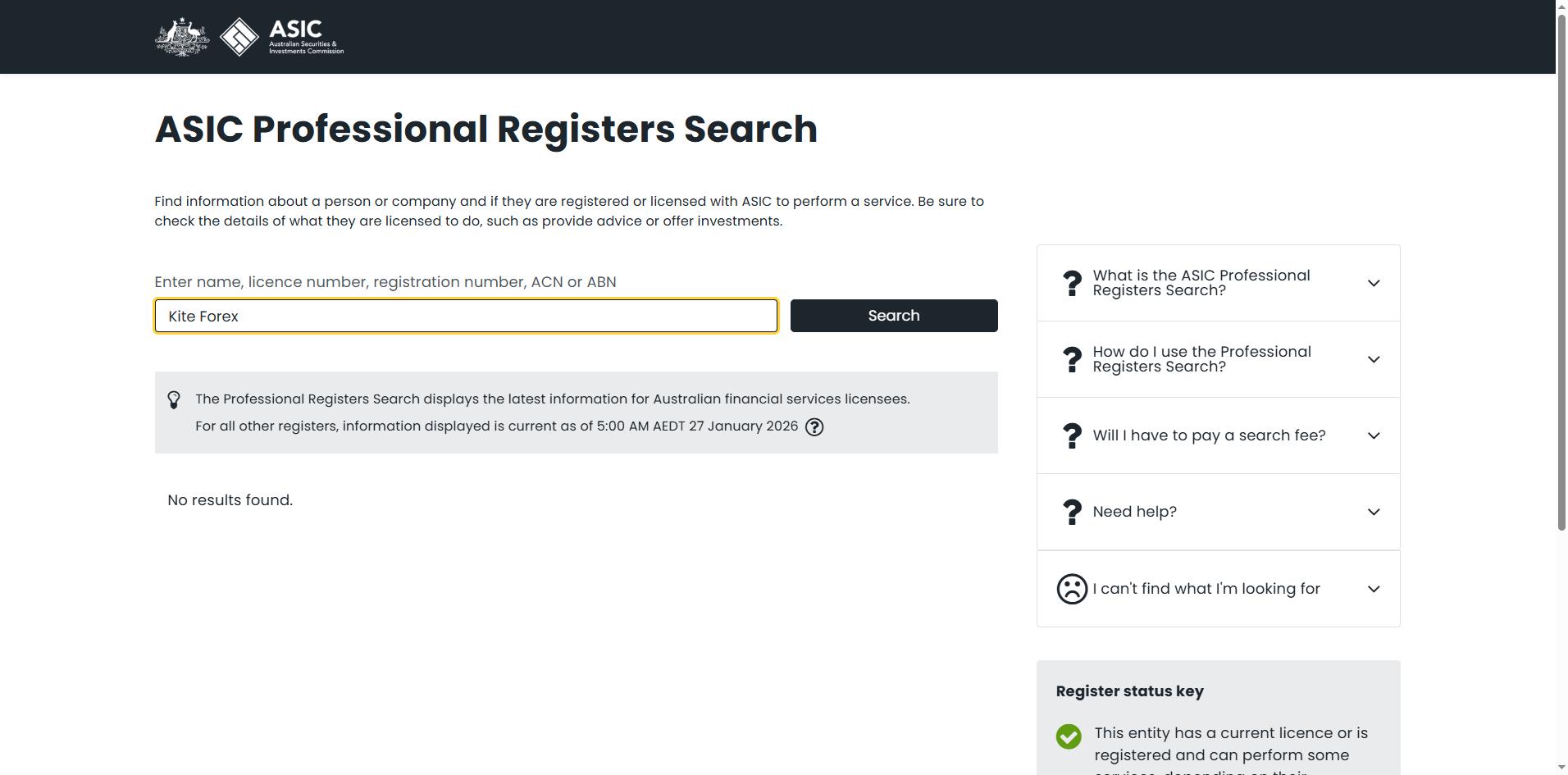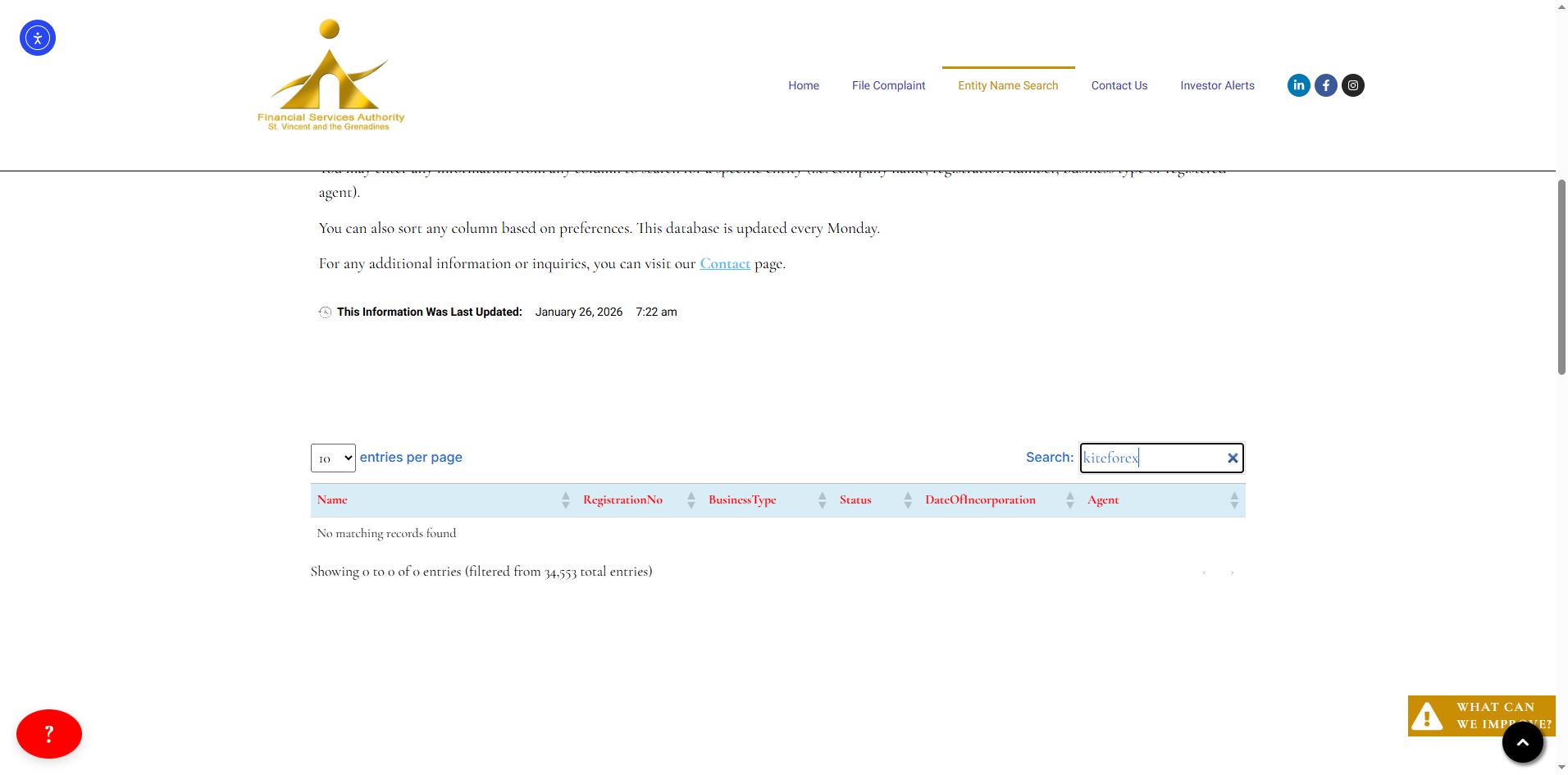 However, our search of the SVG FSA registry found no record of Kiteforex Ltd. Even if such a registration existed, it would only indicate an International Business Company (IBC) status, not a financial or forex license, as the SVG FSA does not regulate trading activities.