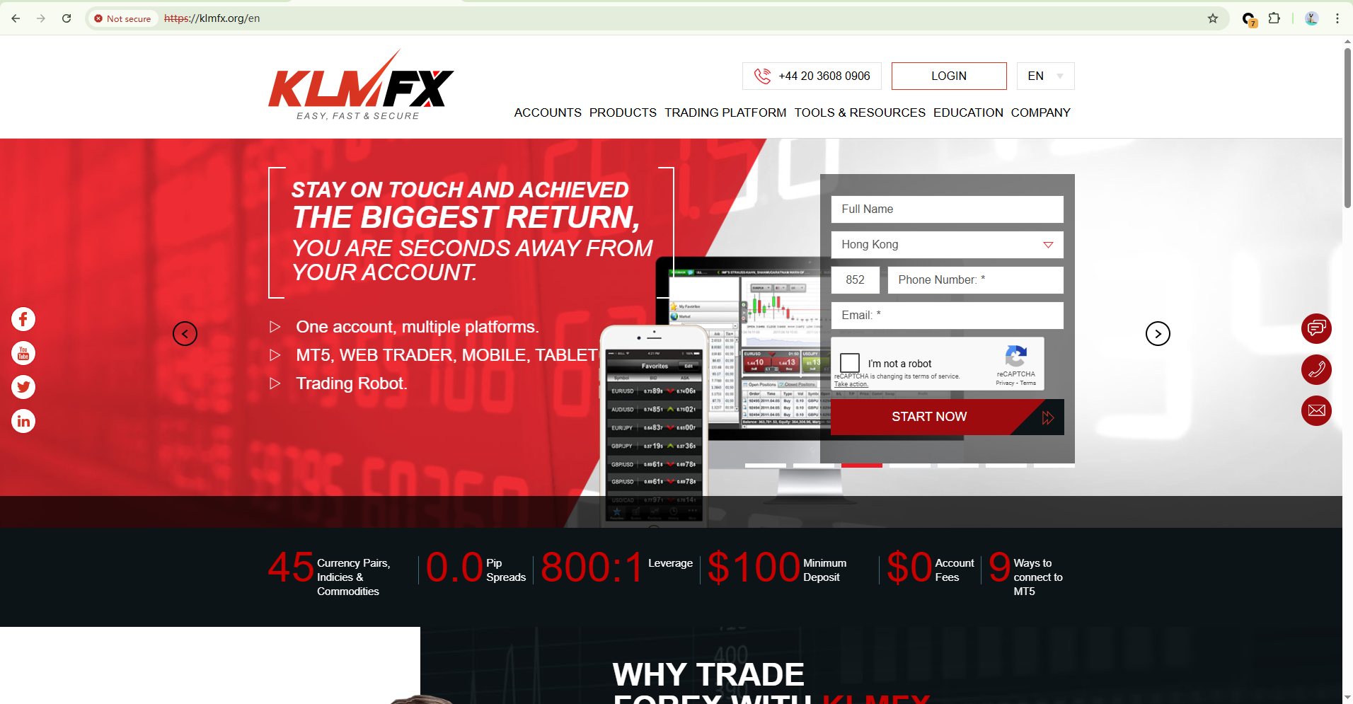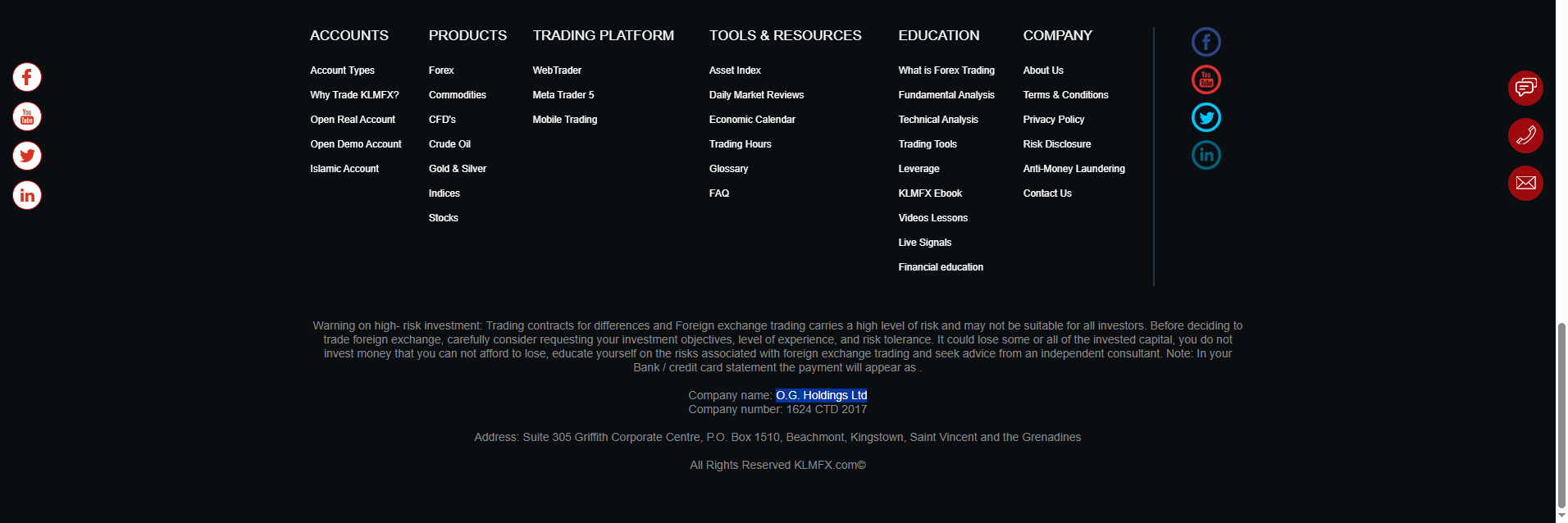 KLMFX does not display any regulatory information on its website. It only states that it is operated by O.G. Holdings Ltd, registered in Saint Vincent. However, upon checking with the Financial Services Authority (FSA) of Saint Vincent and the Grenadines, we found that the company's registration status has been marked as "cancelled." This indicates potential operational issues. Furthermore, the SVG FSA does not regulate foreign exchange activities, and a company registration there does not equate to a legitimate forex brokerage license. Therefore, KLMFX is effectively unregulated and appears to be a scam.