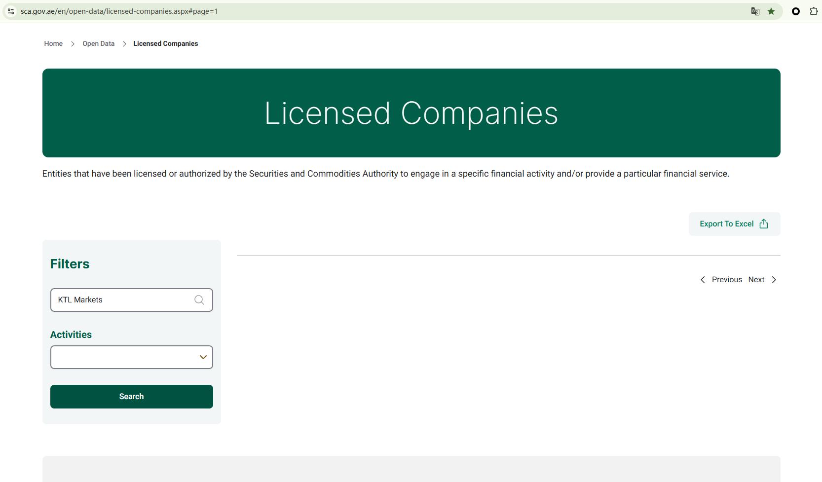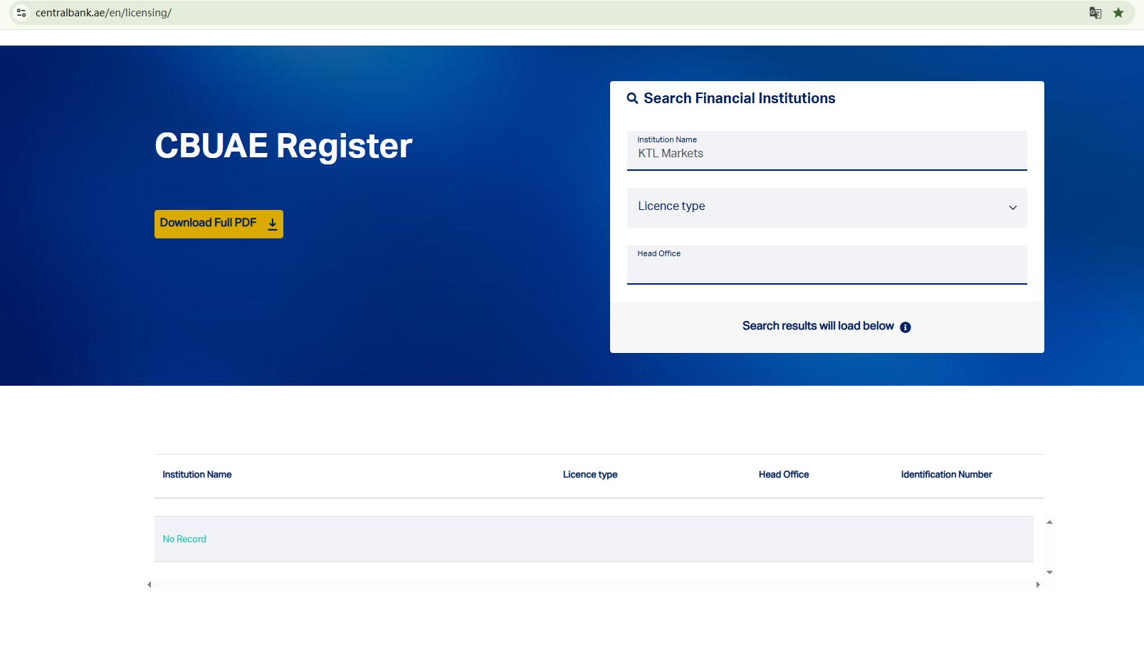 We searched the official register of the UAE Capital Market Authority (UAE CMA) and Central bank of UAE(CBUAE) using all available details, but found no record of KTL Markets Limited or any associated company.