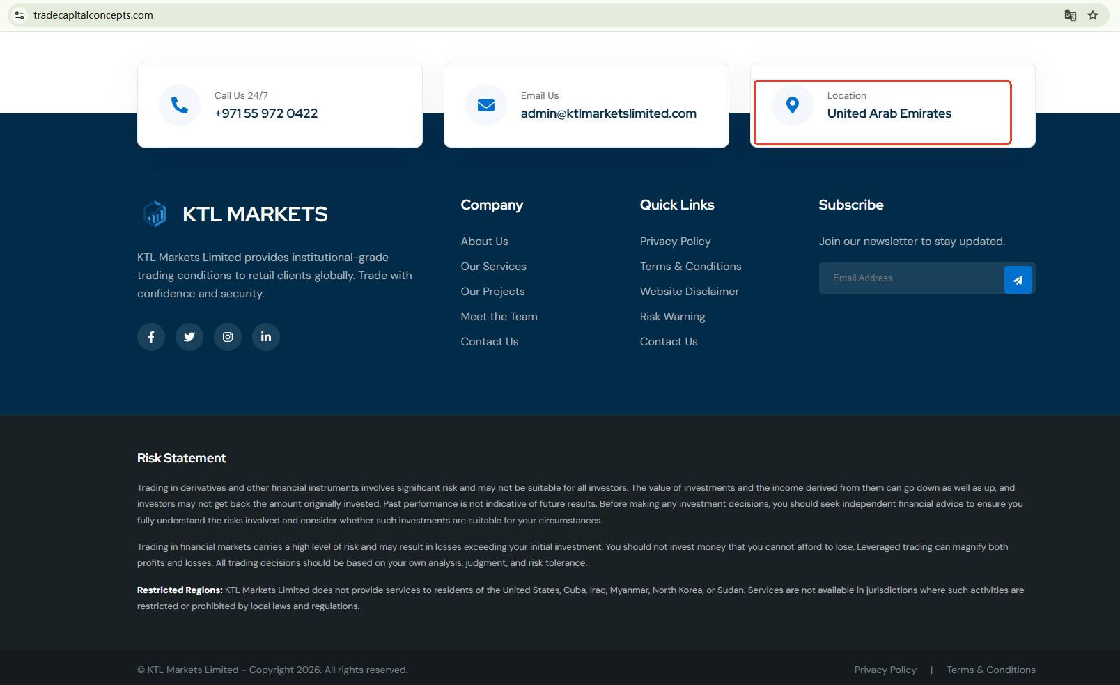 KTL Markets’ website provides no regulatory disclosures, only claims that it was registered in United Arab Emirates.