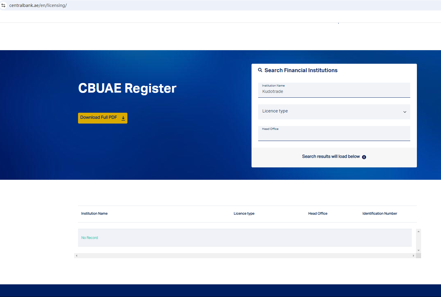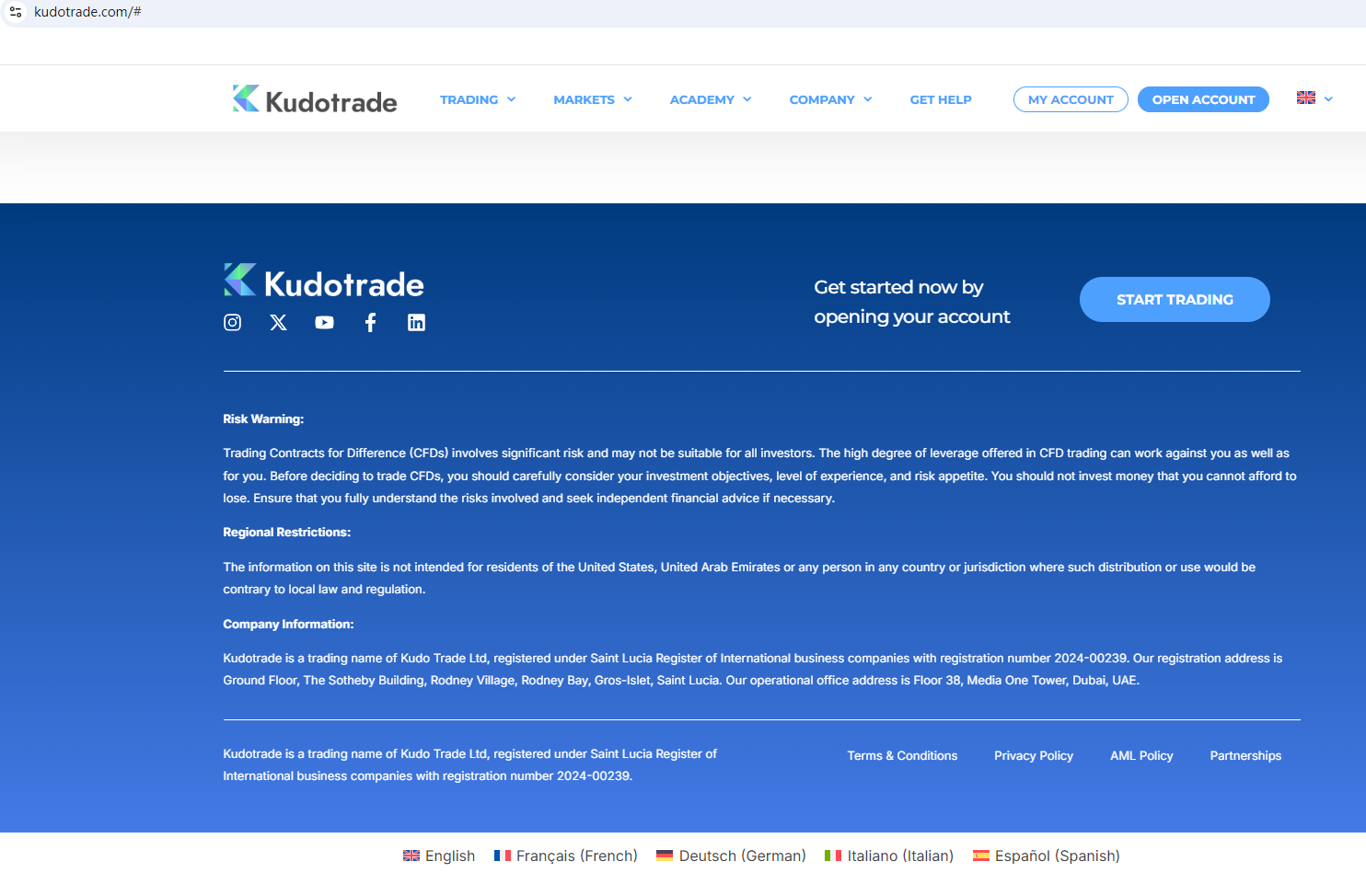 It claims to be registered in Saint Lucia, but it is well known that Saint Lucia does not have the right to regulate foreign exchange. In addition, it claims to have an office address in the UAE. Upon investigation, no matching information was found in Central Bank of U.A.E. (CBUAE), Securities and Commodities Authority (SCA) and DuBai Financial Services Authority (DFSA).In essence, Kudotrade is not regulated by any governing body. Entrusting it with investors' funds is highly risky, as there are no legal protections in place to safeguard the funds.Kudotrade appears to be a scam.