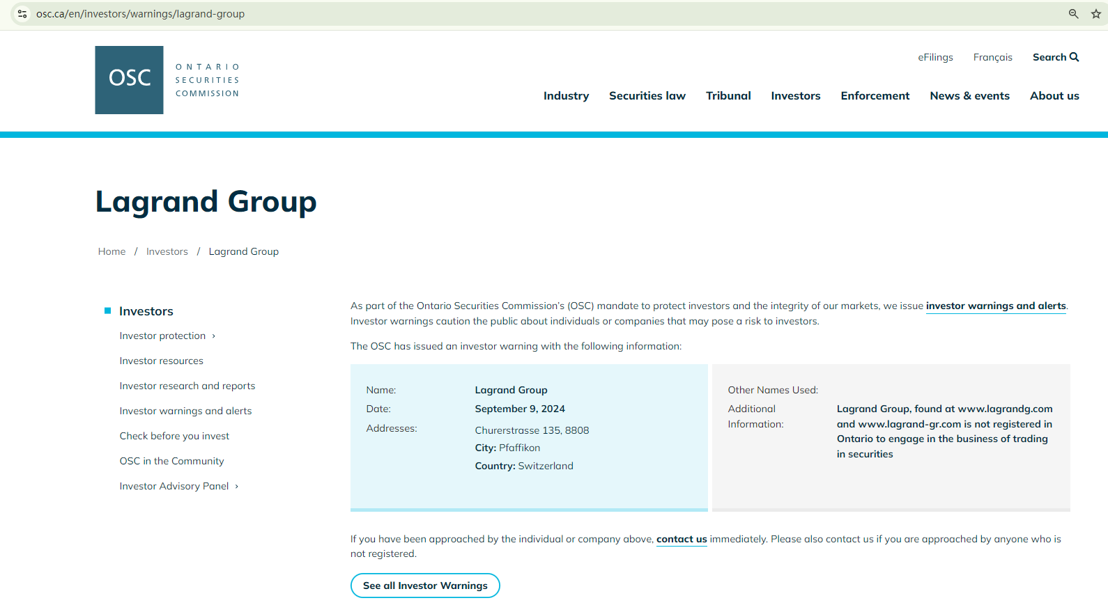 Lagrand Group, in an attempt to appear real, displays an address in Switzerland. If that claim is true, Lagrand Group is required to be authorized by the Swiss Financial Market Supervisory Authority (FINMA). However, the Swiss financial regulator has issued a warning against Lagrand Group, stating that this broker is not entered in its commercial register.