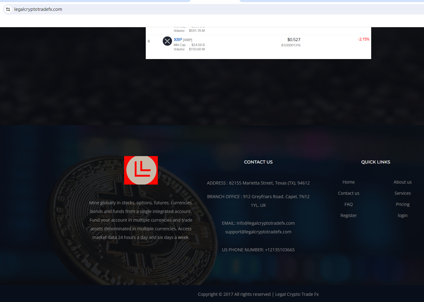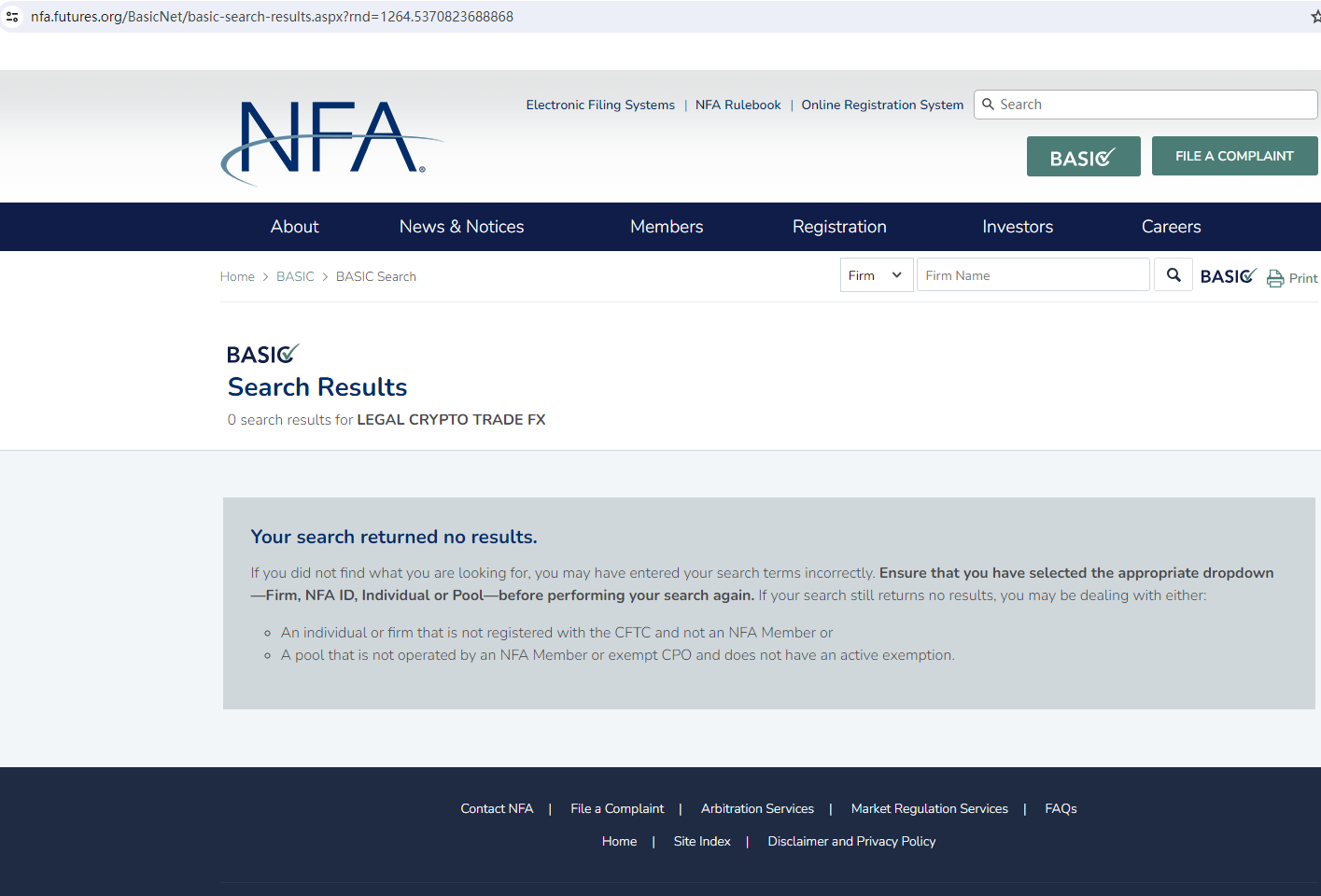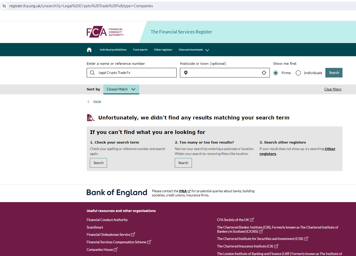 According to its website, it is located in the UK and US. Upon investigation, no matching information was found in the Financial Conduct Authority (FCA) and National Futures Authority (NFA).In essence, Legal Crypto Trade Fx is not regulated by any governing body. Entrusting it with investors' funds is highly risky, as there are no legal protections in place to safeguard the funds.Legal Crypto Trade Fx appears to be a scam.