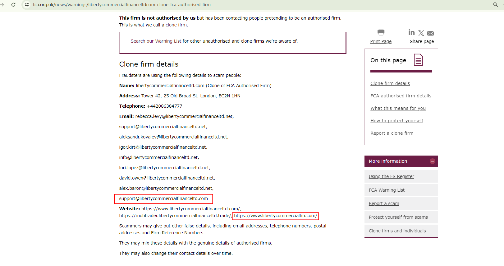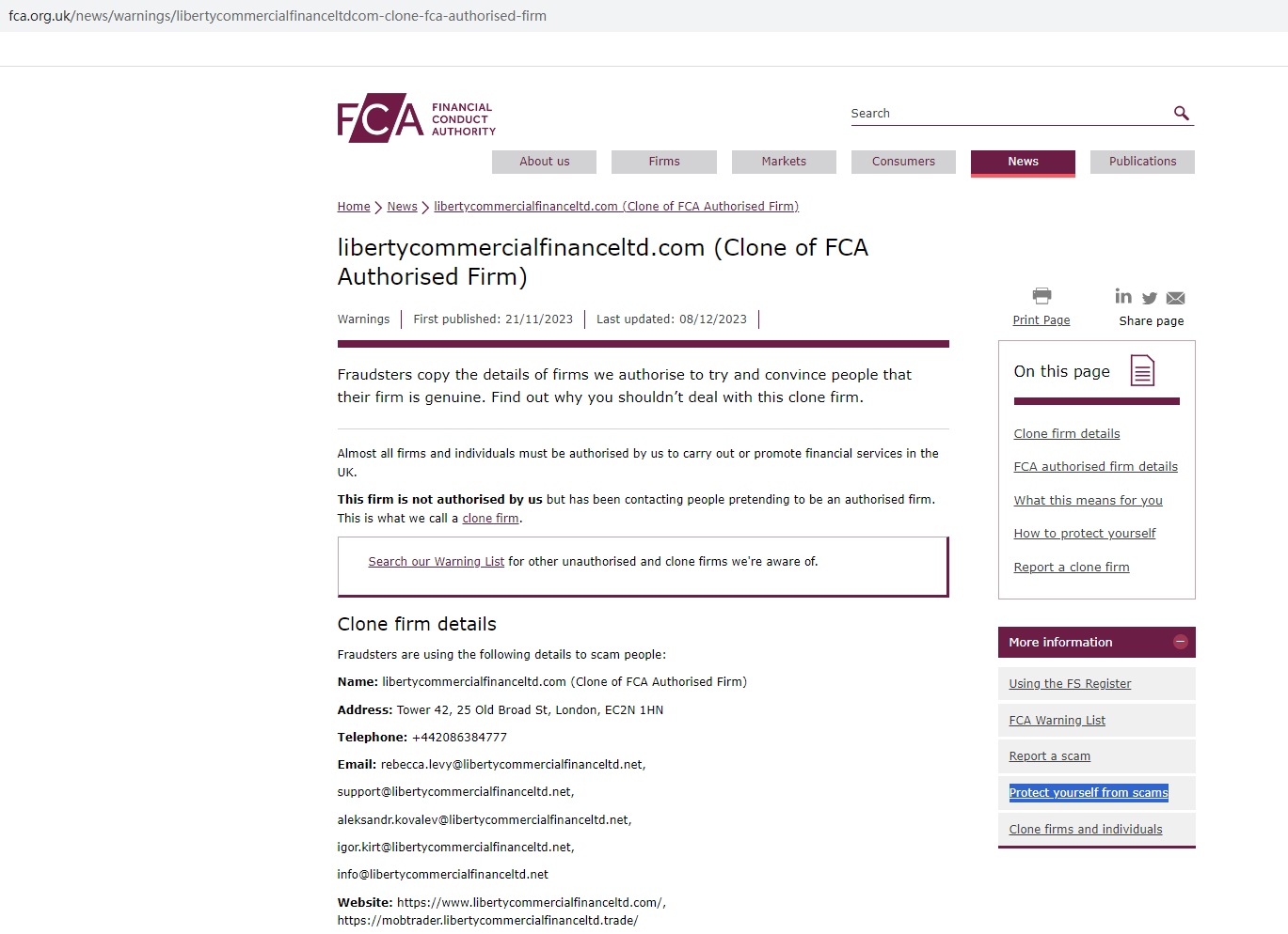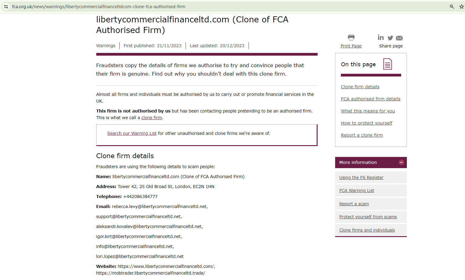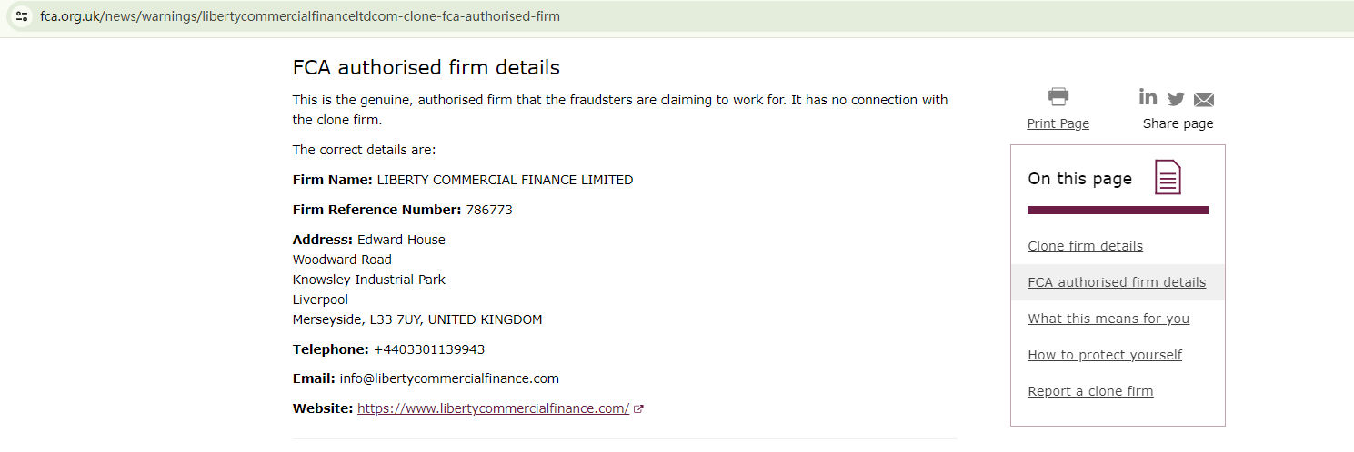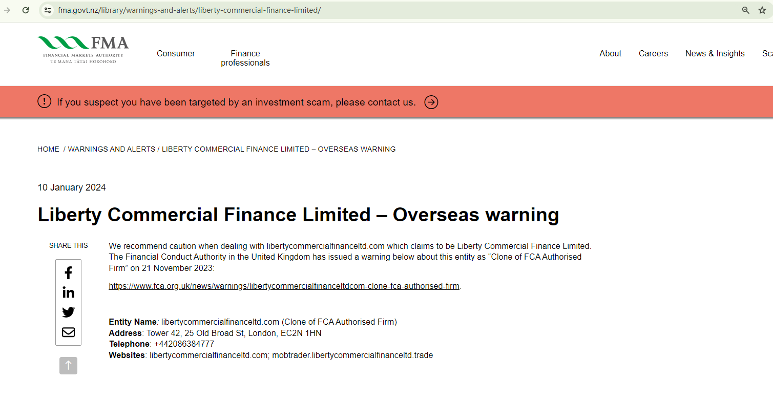 According to its website (libertycommercialfinanceltd.com), it is located in the UK. However, our investigation revealed that the Financial Conduct Authority (FCA) has issued a warning against it, identifying this broker as a clone of an FCA-authorized firm, Liberty Commercial Finance Limited.