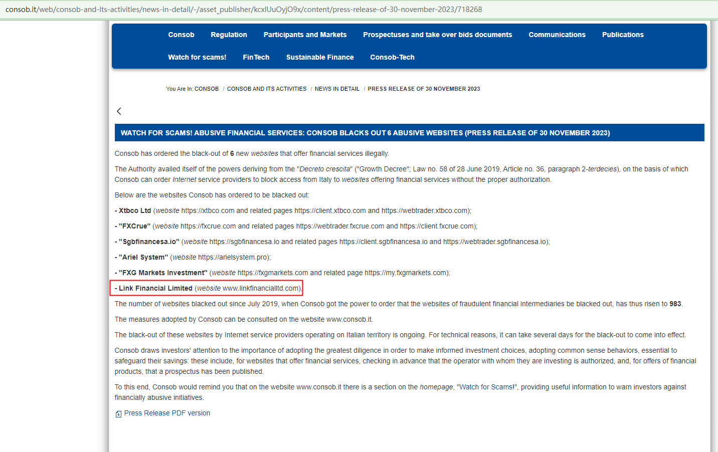 Furthermore, the Italian Companies and Exchange Commission (CONSOB) has ordered the blackout of Link Financial Limited's website due to its illegal offering of financial services, highlighting the substantial risks involved.