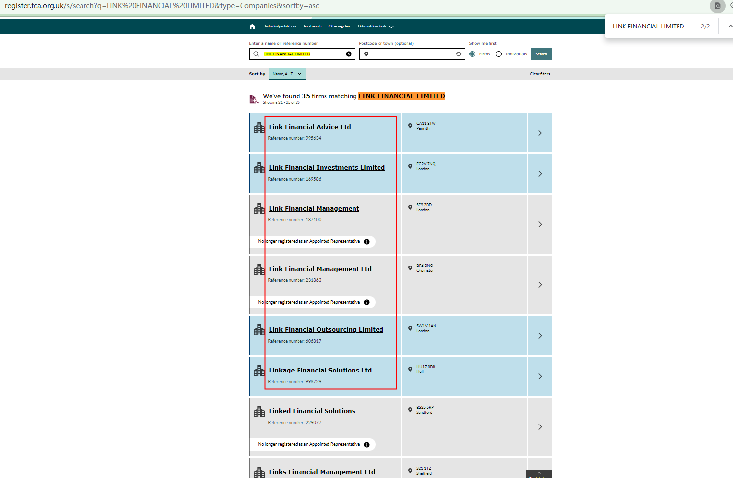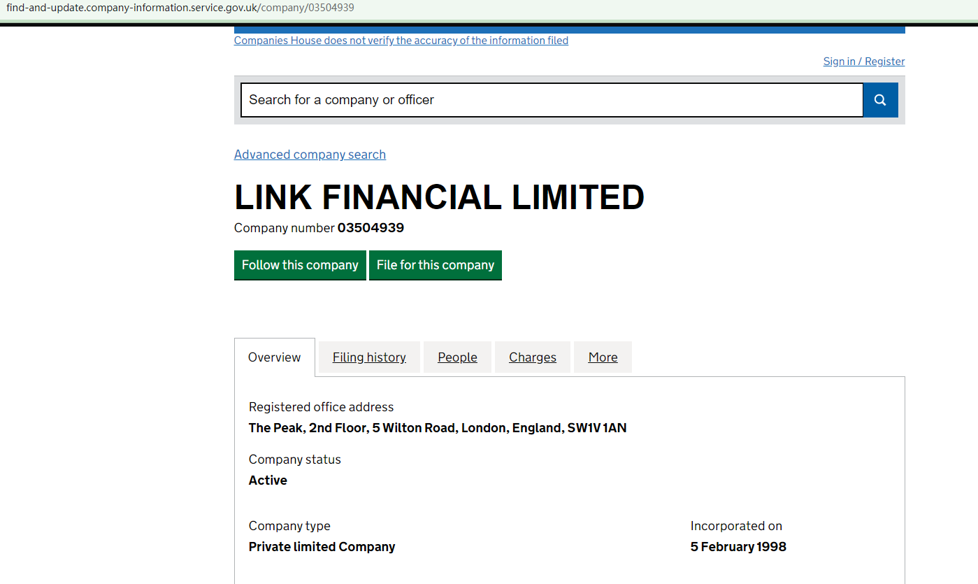 Link Financial Limited provides a registration number on its website but does not specify the authority with which it is registered. Given its UK address, we inferred that it might be a registration number issued by the Companies House (CH). A search in the CH register did find a company under this number named Link Financial Limited. However, records suggest that it was incorporated in 1998, which contradicts the website's claim about its history. This inconsistency raises concerns about potential identity theft.