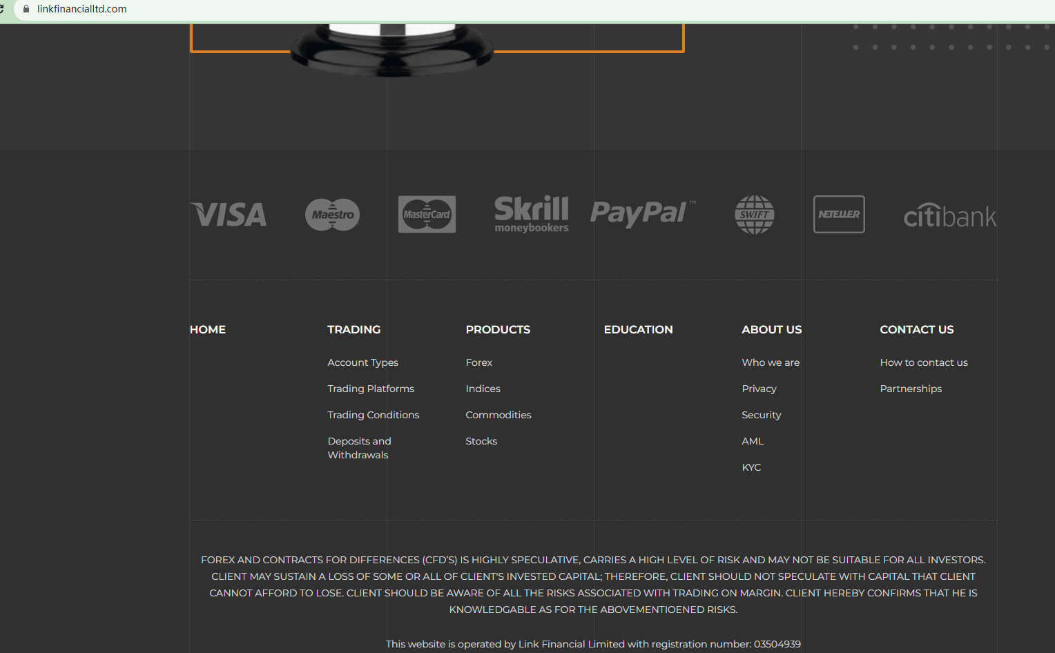 While Link Financial Limited claims to have been founded in 2001, its domain name, linkfinancialltd.com, was first registered in April 2023. This discrepancy raises a red flag.Link Financial Limited provides a registration number on its website but does not specify the authority with which it is registered. Given its UK address, we inferred that it might be a registration number issued by the Companies House (CH). A search in the CH register did find a company under this number named Link Financial Limited. However, records suggest that it was incorporated in 1998, which contradicts the website's claim about its history. This inconsistency raises concerns about potential identity theft.We also searched for this company in the register of the Financial Conduct Authority (FCA), but found no such company licensed by the UK financial watchdog. This lack of authorization is a significant indicator of a scam.Furthermore, the Italian Companies and Exchange Commission (CONSOB) has ordered the blackout of Link Financial Limited's website due to its illegal offering of financial services, highlighting the substantial risks involved.In essence, Link Financial Limited is not regulated by any governing body. Entrusting this broker with investors' funds is highly risky, as there are no legal protections in place to safeguard the funds.Link Financial Limited is unequivocally a scam.