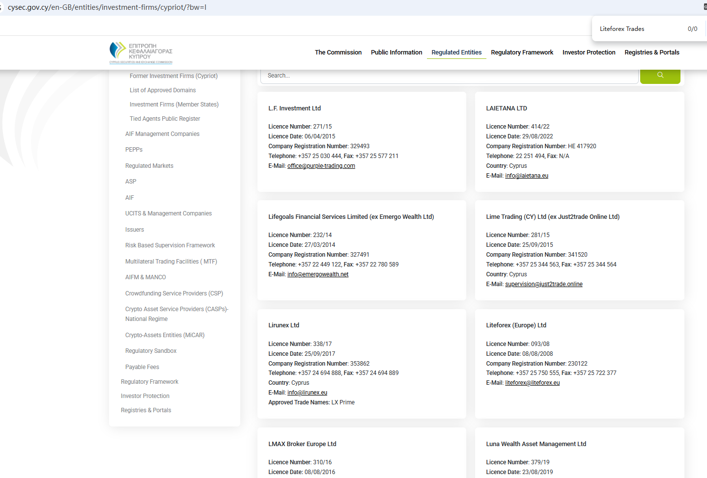 According to its website, it is regulated by both the Financial Conduct Authority (FCA) and the Cyprus Securities and Exchange Commission (CySEC). However, a search revealed no matching information with CySEC. Furthermore, the FCA issued a warning regarding Liteforex Trades, suspecting that this company may be offering financial services or products without the necessary authorization.