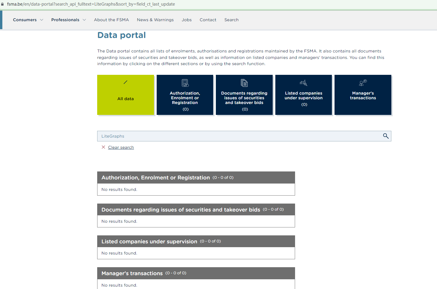 Despite claims of being based in Belgium, a search in the register of the Financial Services and Markets Authority (FSMA) did not yield any corresponding results. This indicates that LiteGraphs has not obtained the required authorization from this financial regulator. It's worth noting that the FSMA implemented a ban from 18 August 2016 on the distribution of over-the-counter (OTC) derivatives, including Forex, CFDs, and Binary options among Belgian retail clients. This ban should be considered when choosing a Belgian Forex broker.
