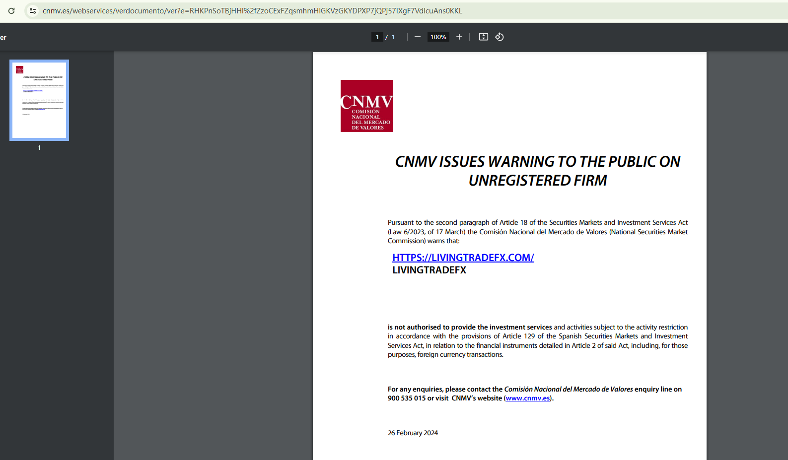 What's more, the Comisión Nacional del Mercado de Valores (CNMV) has added LivingTradeFX to its warning list for providing investment services without authorization.
