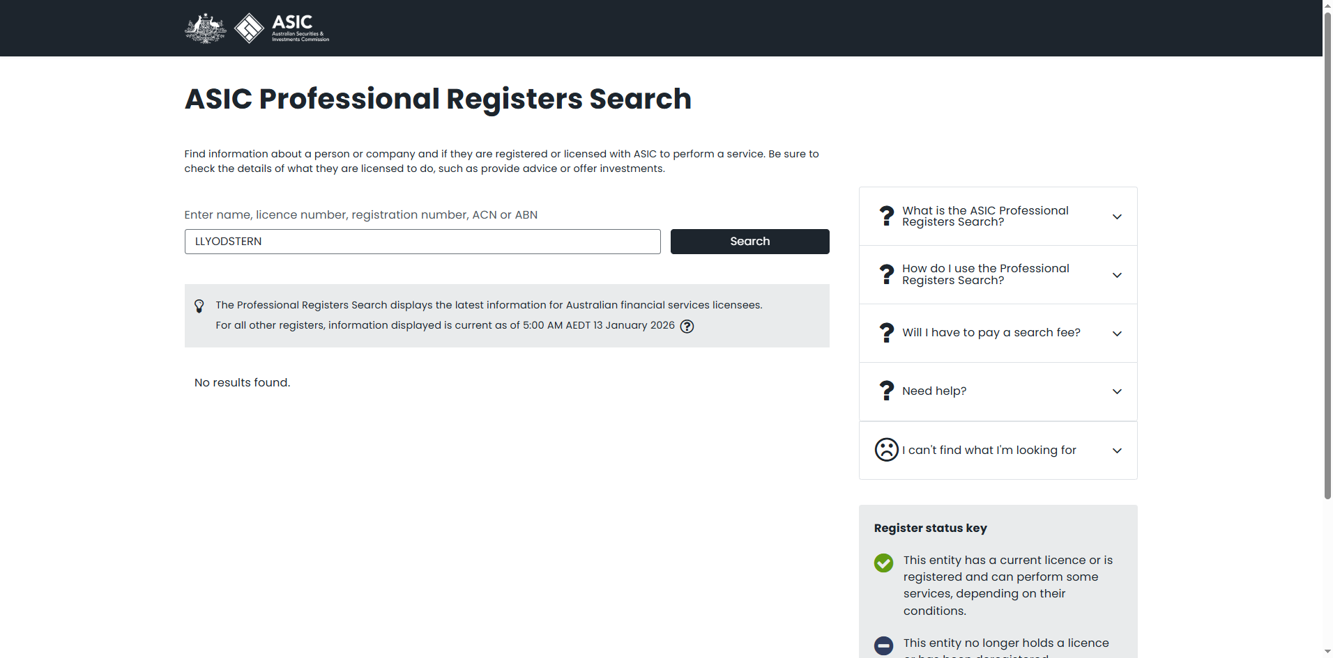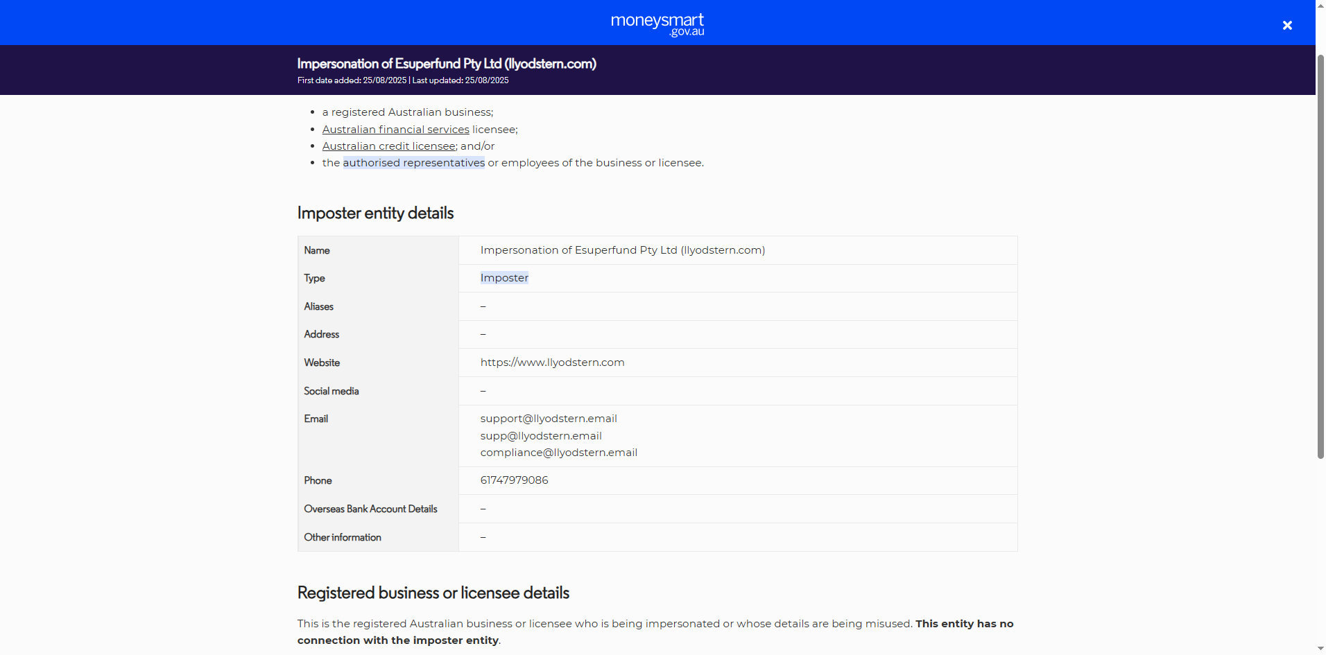 LLYODSTERN does not disclose its legal entity name, registered address, or any details about its ownership or operational structure, but only lists an Australian phone number, our search of the Australian Securities & Investments Commission (ASIC) register found no record of any company or authorized representative associated with the name LLYODSTERN. More critically, we discovered that on 25 August 2025, ASIC added LLYODSTERN to its public warning list, explicitly stating that this entity was being impersonated or whose details are being misused, and had no connection with the imposter entity.