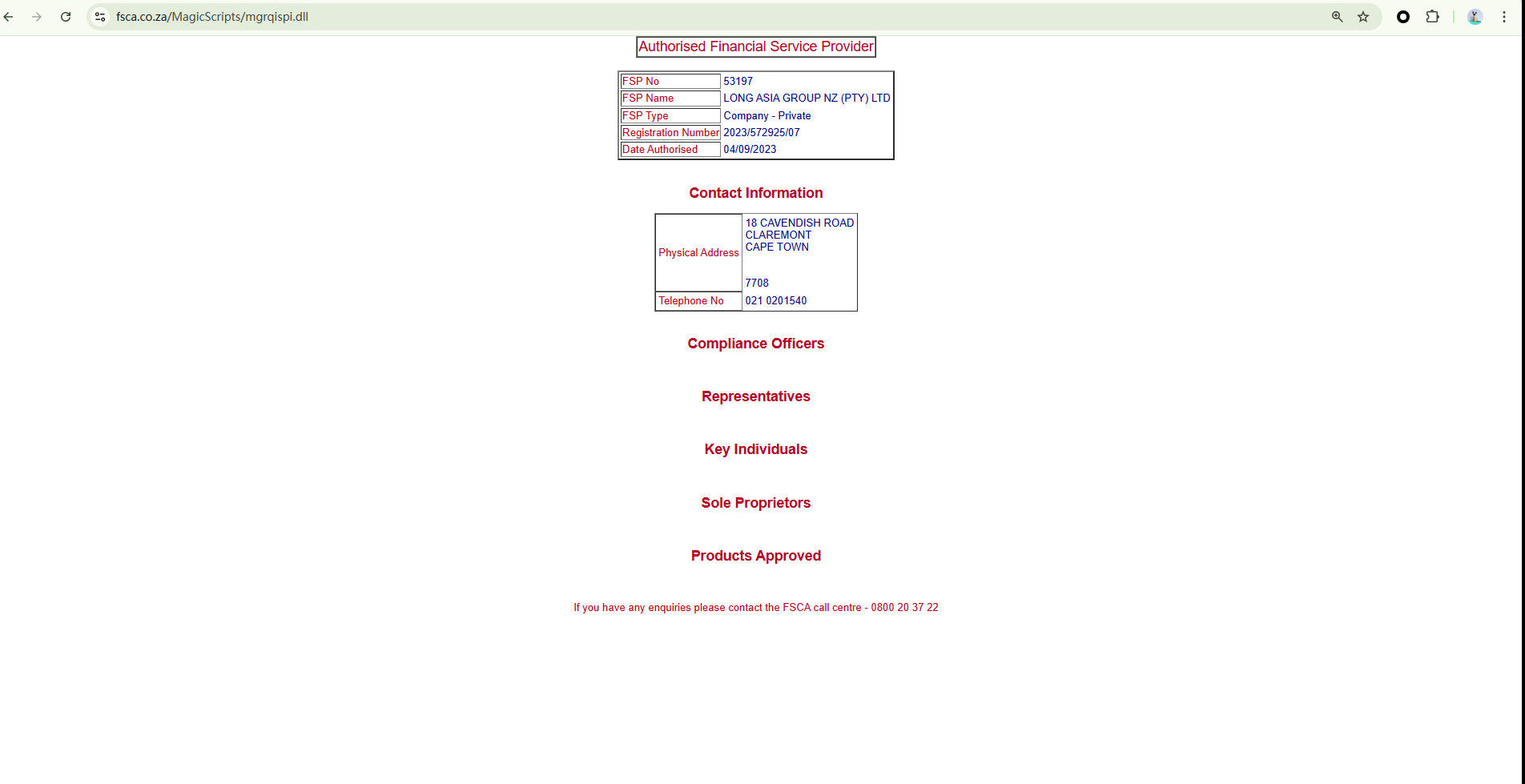During our initial investigation, Long Asia claimed to be regulated by the South African Financial Sector Conduct Authority (FSCA). Based on the license number they provided, we verified that the FSCA register listed the entity as LONG ASIA GROUP NZ (PTY) LTD, as shown in the attached image.