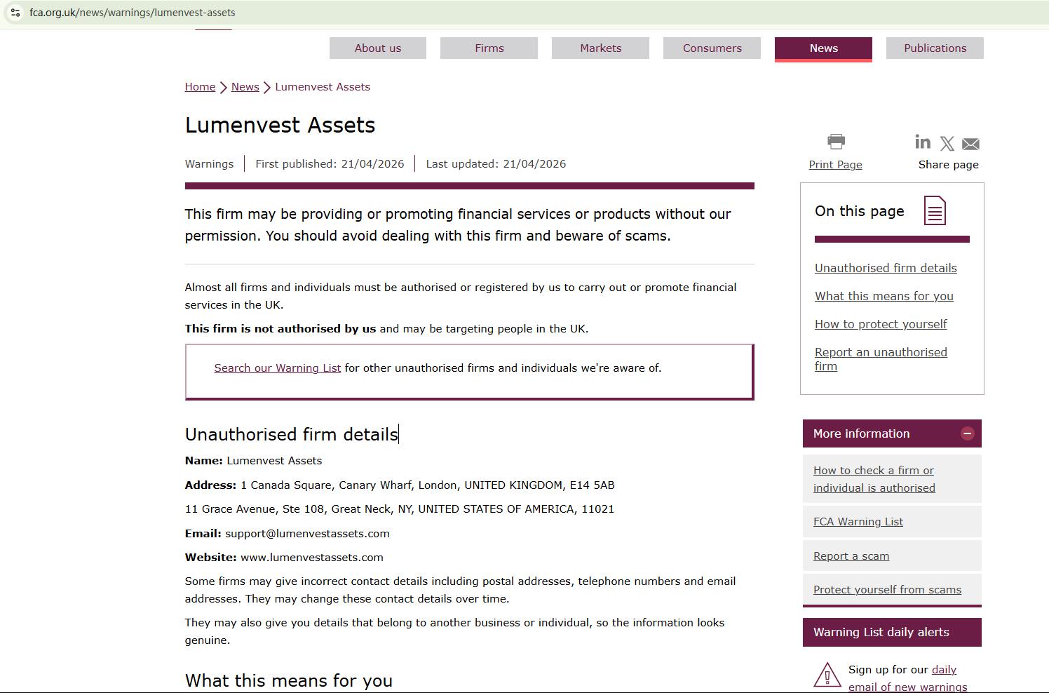 Besides, the Financial Conduct Authority (FCA) issued a warning against Lumenvest Assets, believing this company might be providing financial services or products without proper authorization in the UK.