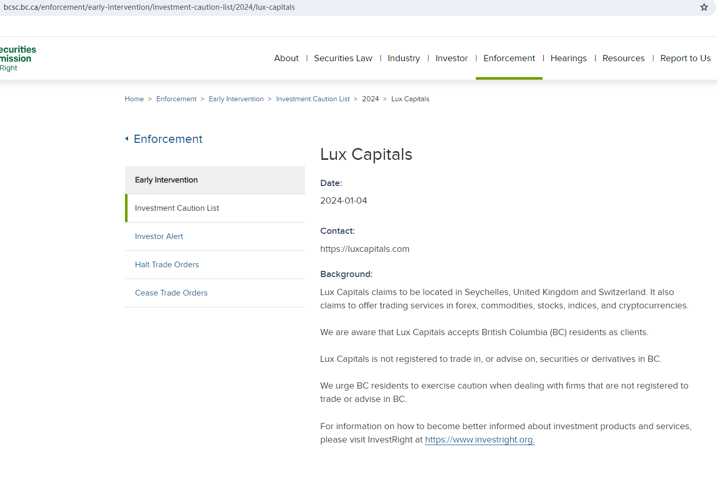 In addition, the British Columbia Securities Commission (BCSC) issued a warning that Lux Capitals was providing financial services or products without authorisation.